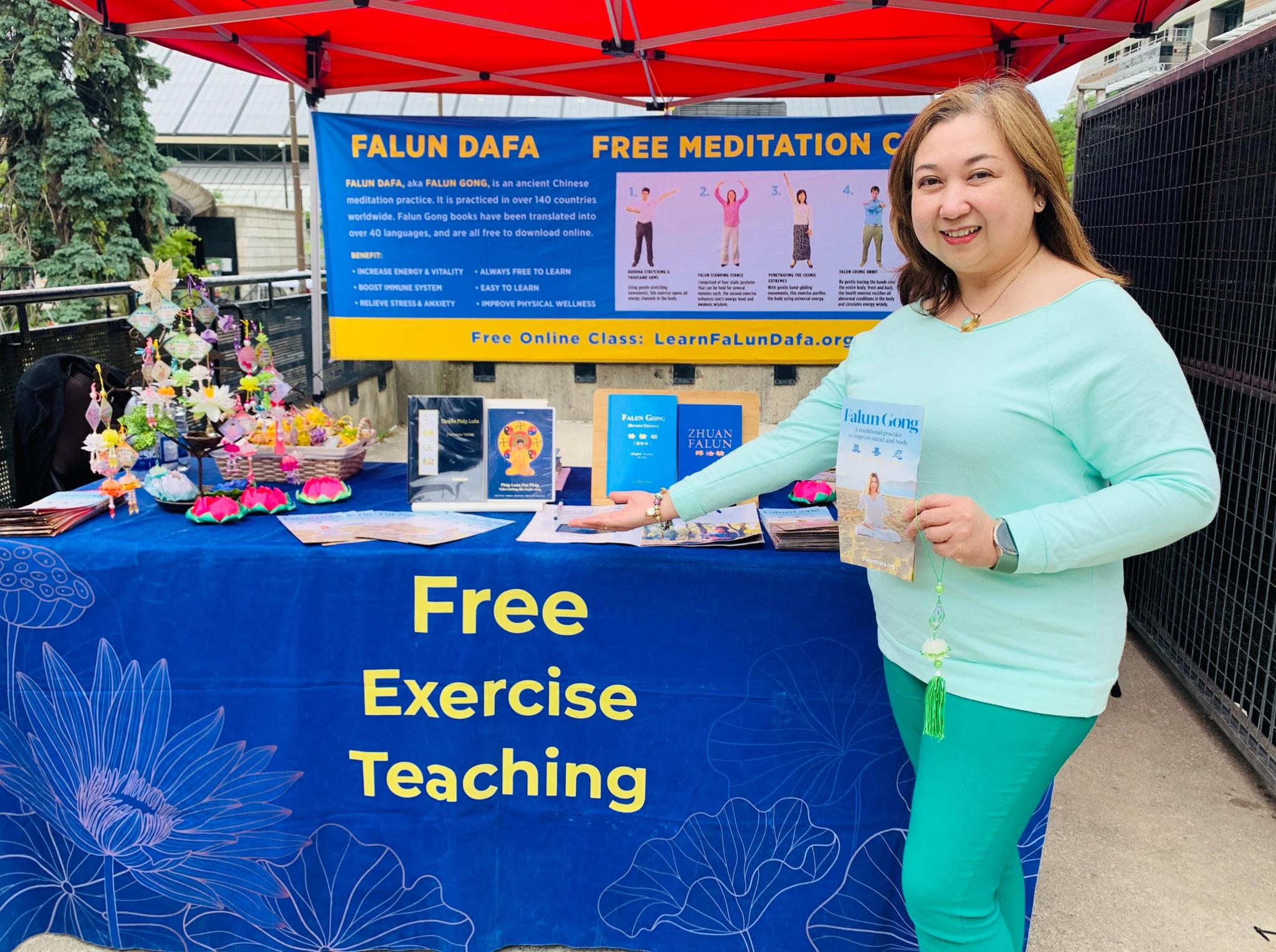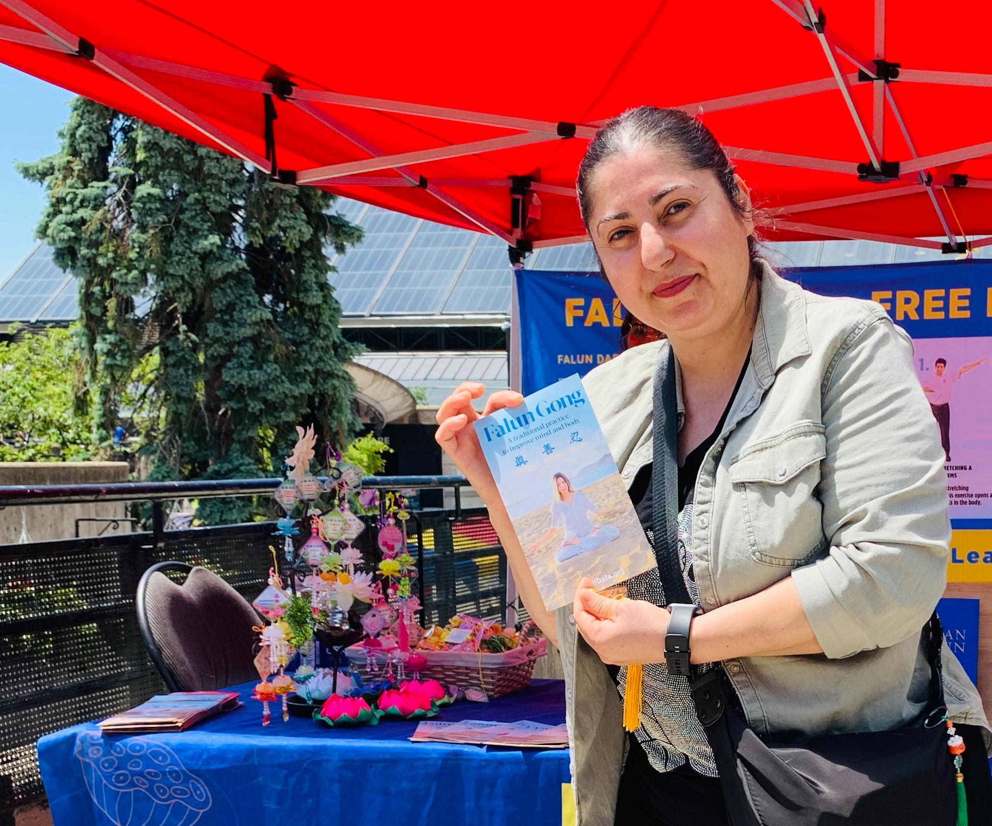 卡拉(Carla)来自奥罗拉(Aurora)地区,在经过大法展位时,正在功法展示的法轮功学员吸引了她,有学员递给她大法真相资料,并向她介绍。卡拉了解到法轮功有五套功法动作,同时又是修心的功法,在展位即可免费学炼。于是她跟随学员学了第一套到第四套功法。在卡拉学炼时,她的两个孩子也跟着妈妈一起学。