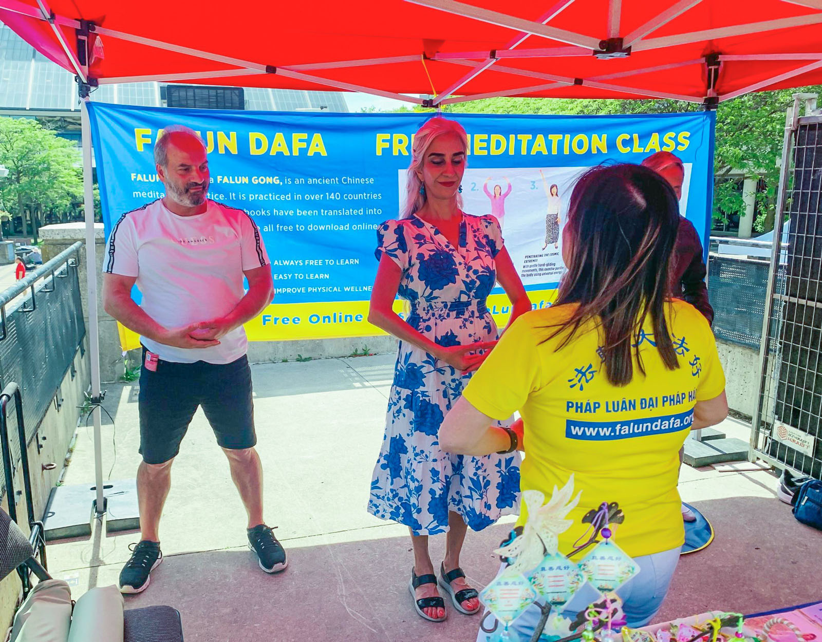 麦克尔(Michael)和他的太太来到大法展位,听完学员的介绍后,他们向学员询问在哪里可以学炼。学员向他们介绍了免费的网上法轮功学习班(LearnFalunGong.com),同时在展位也可以免费学炼,于是夫妇二人便现场跟着学员一起炼功。