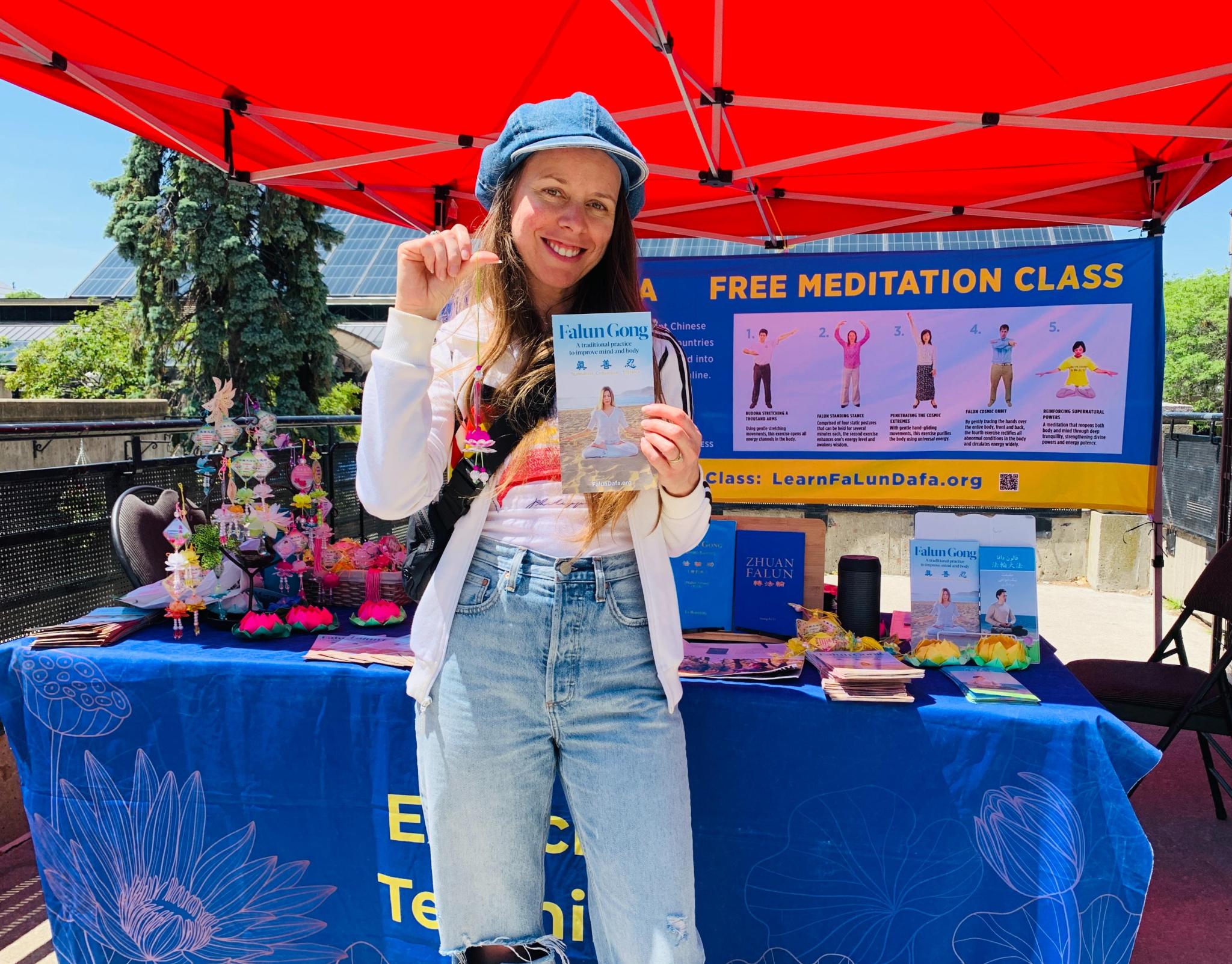 乔伊斯(Joyce)是一名住在北约克的学生。她路过大法展位时,学员给她递上大法介绍资料,向她介绍法轮大法,并告诉她可在网上免费学功。乔伊斯对此产生了兴趣,便与学员交谈起来。