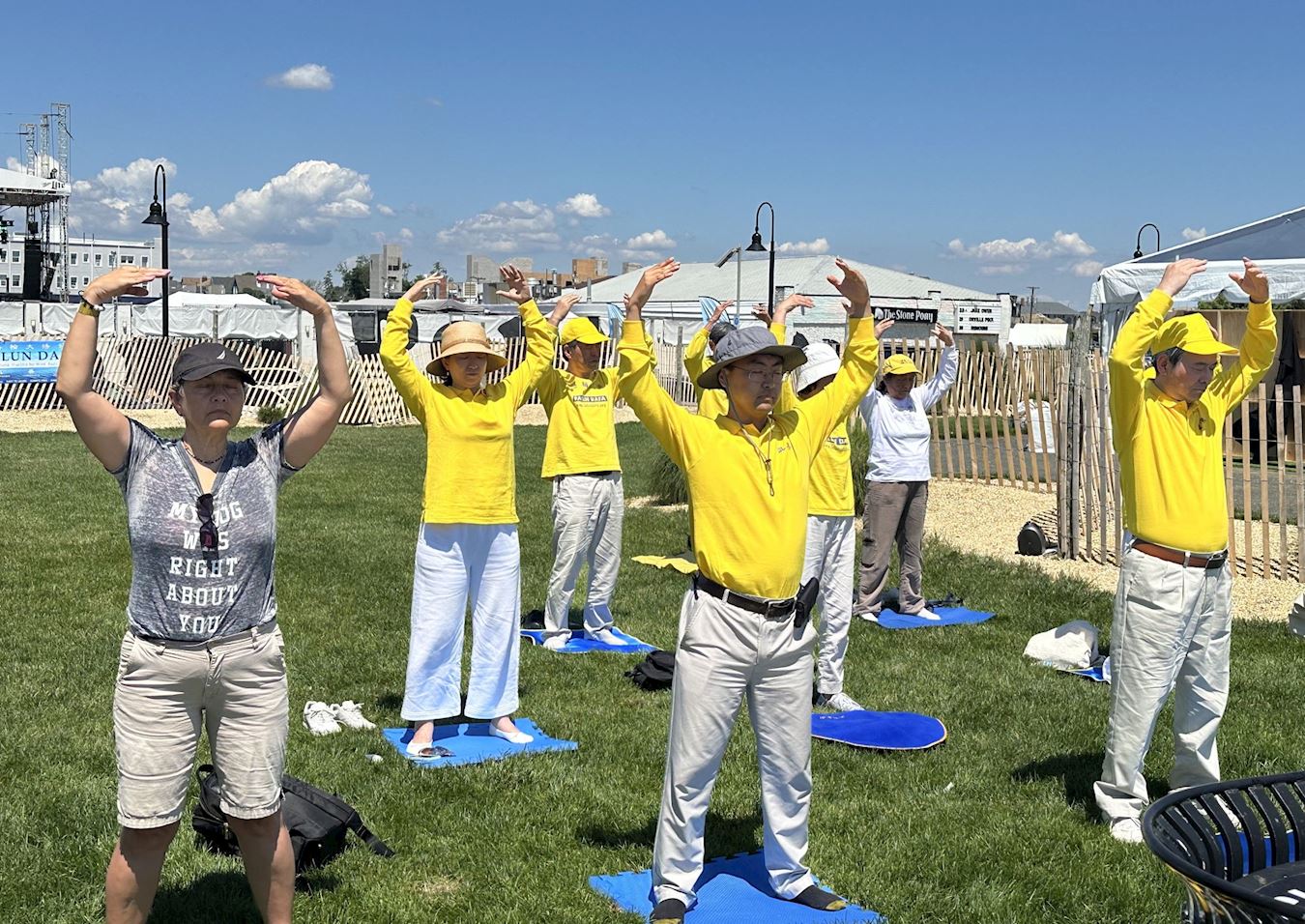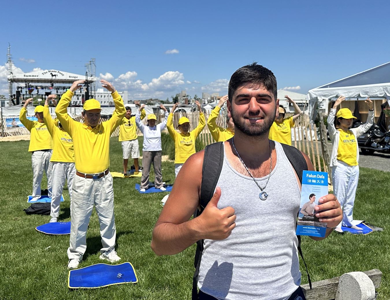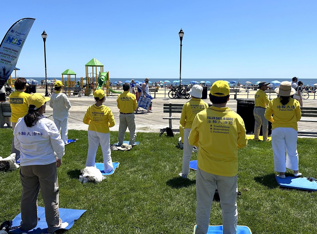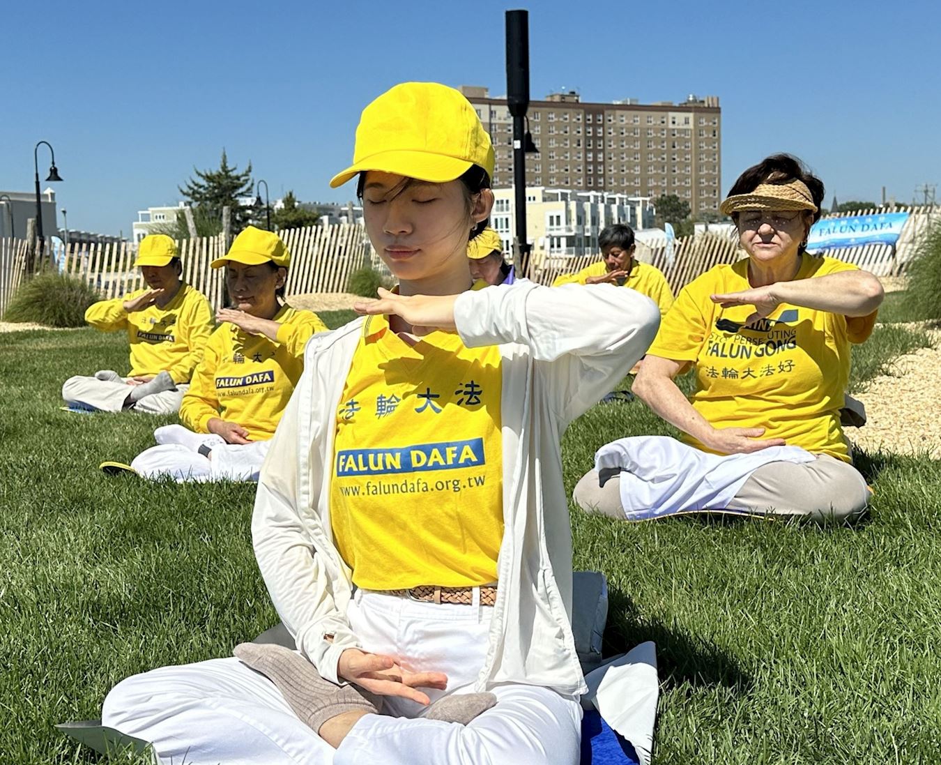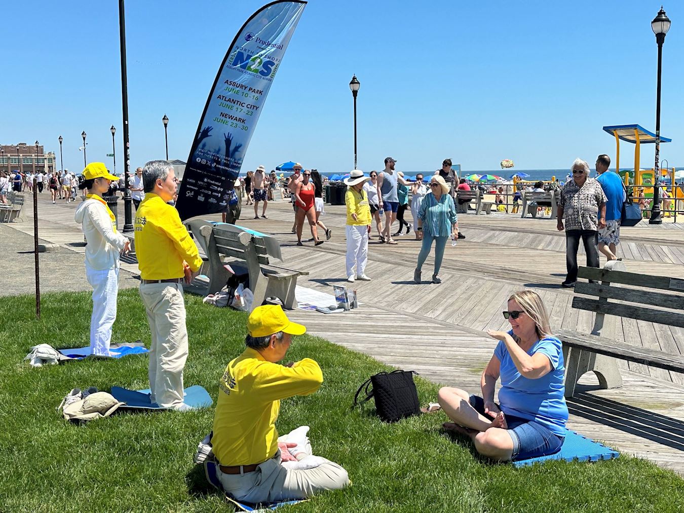 在纽约州政府担任审计官的海兹·贝勒兹(Hayzee Belez)当天同家人来到泽西海滩度周末,她被法轮功学员的炼功场面所吸引,在现场学习功法后,也马上加入法轮功学员的炼功场。