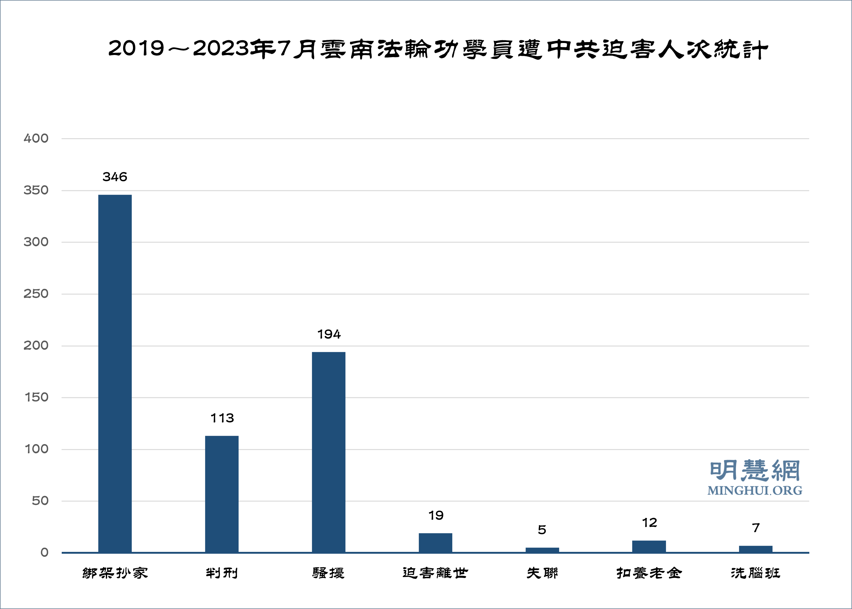 ![]() 图:2019~2023年7月云南法轮功学员遭中共迫害人次统计 |