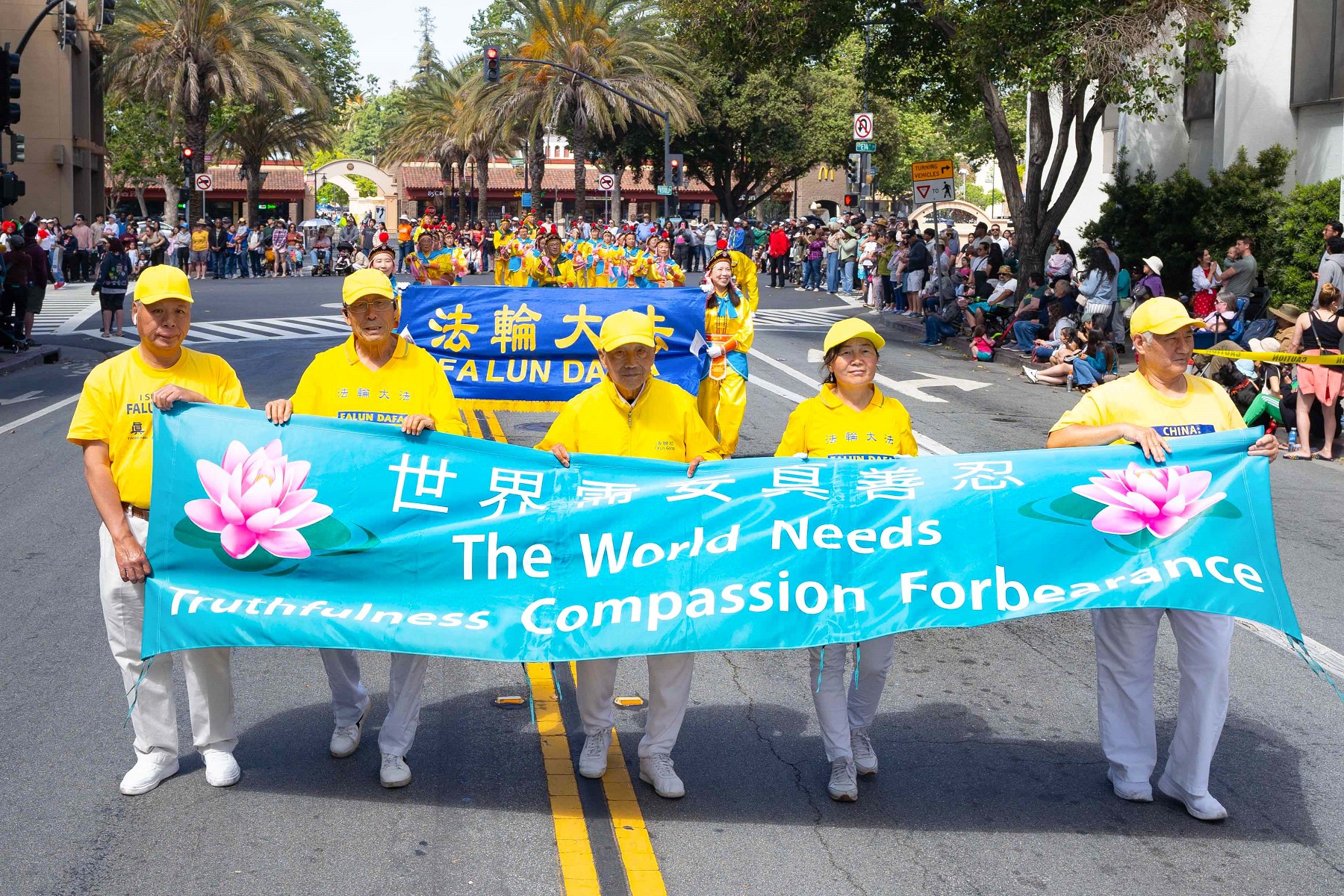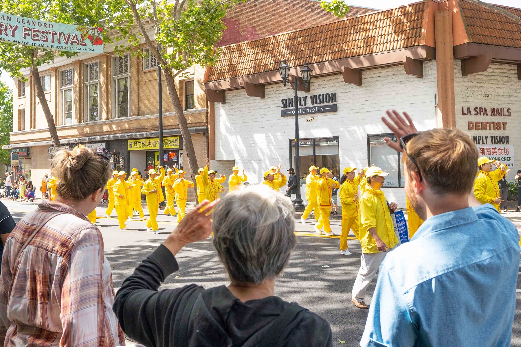 由旧金山湾区的法轮功学员组成的炼功队和腰鼓队参加了游行活动。一路上,法轮功学员向观众演示功法,获得了观众的喜爱和欢迎。许多人说,法轮功的功法演示为他们带来宁静、祥和,让他们身体变得轻松。腰鼓队的表演则让观众振奋人心,尤其是他们发现队员中有不少老年人,更发出赞叹声。