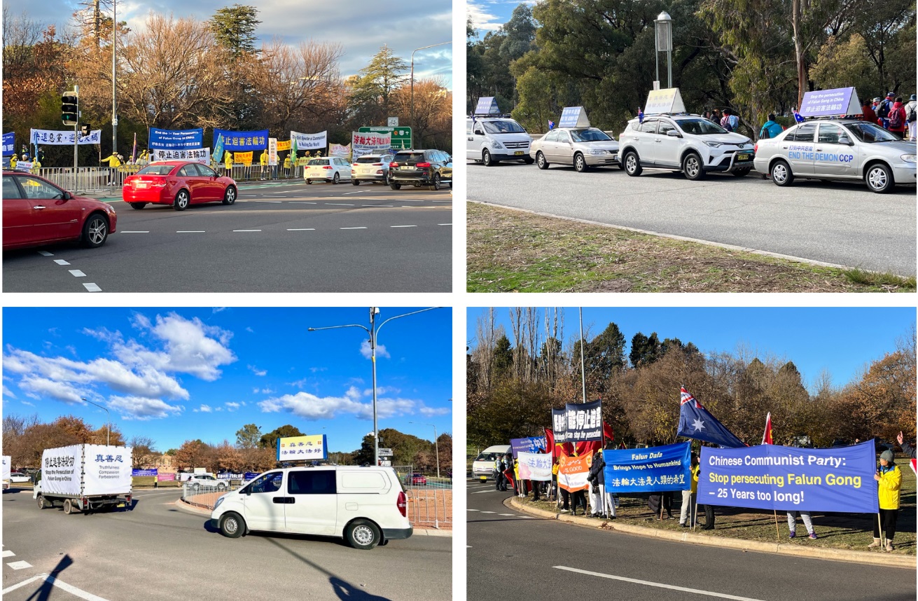 ![]() 图2~5:六月十六日和十七日,法轮功学员在堪培拉国会大厦周边及中使馆前展示真相横幅,同时,真相车队在国会大厦周边巡游。 |