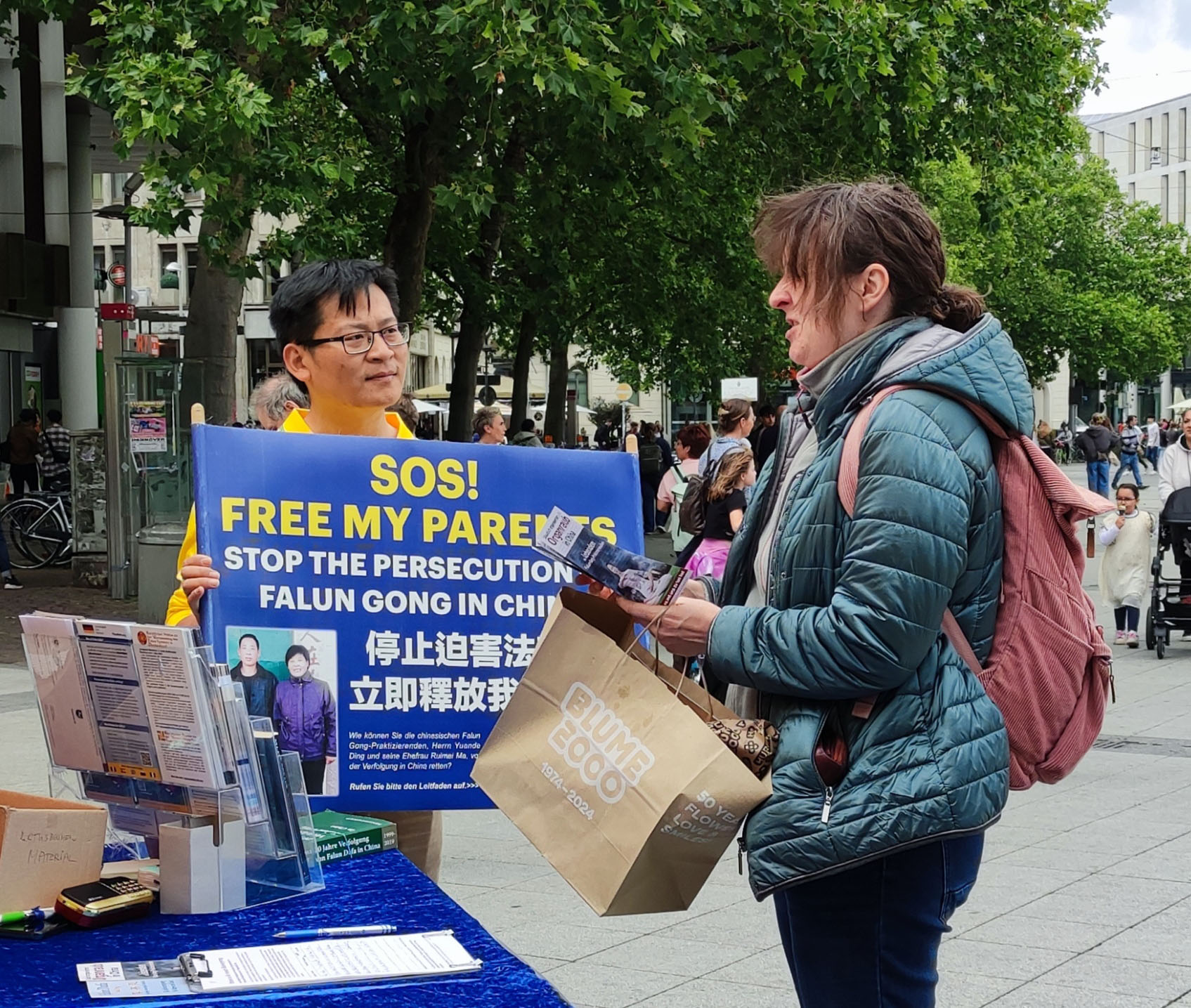 在信息点上,学员们告诉民众,多年来中国的法轮功学员一直遭受着中共残酷的迫害。住在德国的丁先生也在信息点讲述自己父母因修炼法轮功被中共迫害的经历。很多民众都关切的驻足聆听。许多人问法轮功学员:“我们能做些什么?我们怎样才能支持你们?”