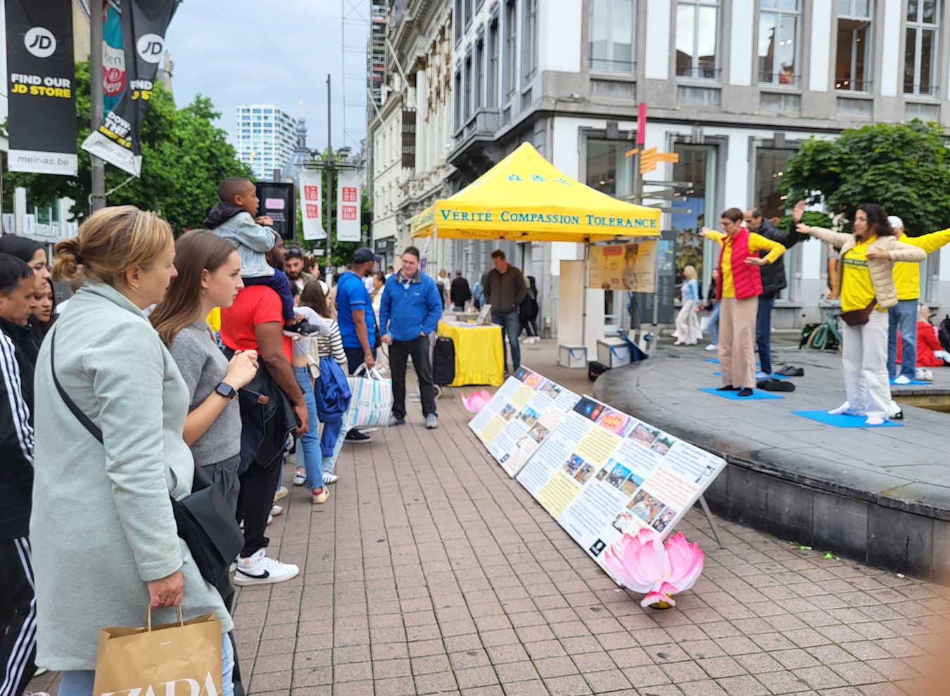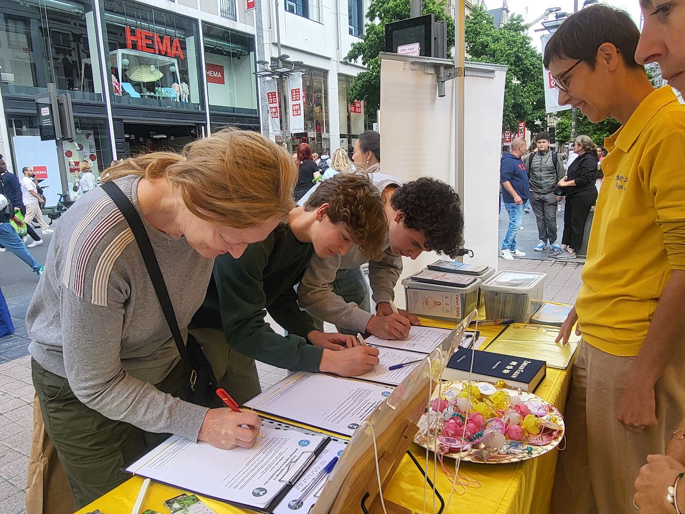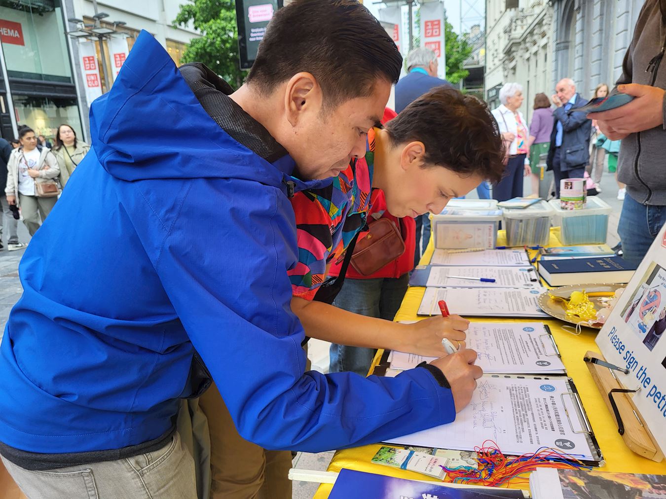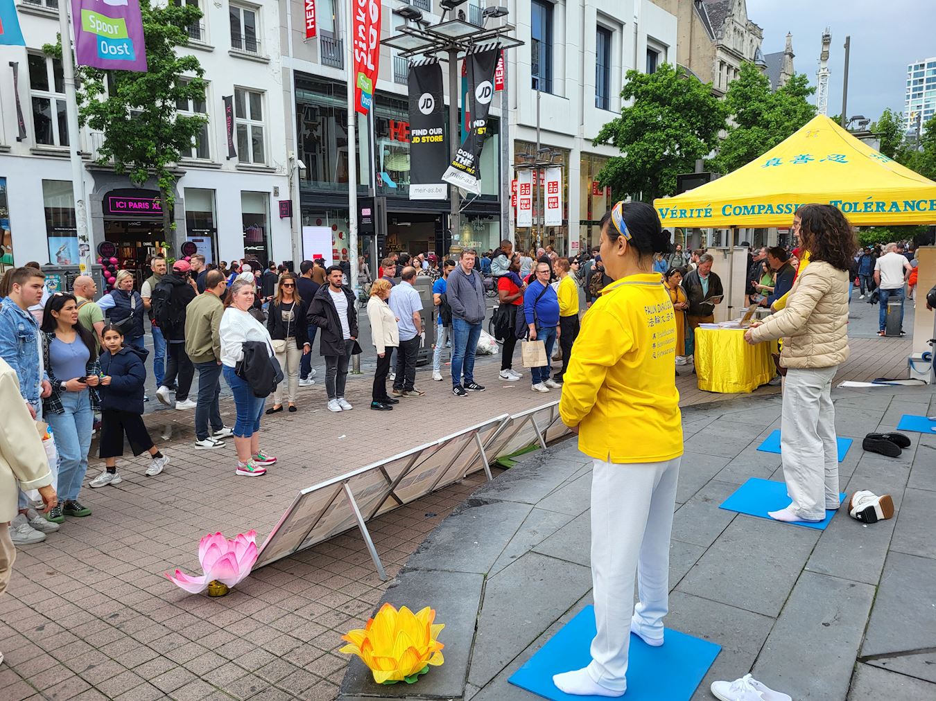 二零二四年六月十五日,学员们再次来到这里,向市民演示功法、发真相资料、并讲述法轮大法的美好与中共迫害法轮功的真相。善良的民众纷纷在呼吁停止迫害法轮功的请愿书上签名,他们对法轮功真、善、忍的原则产生共鸣,并强烈反对中共迫害(真善忍)价值。还有人说,法轮功的原则是善良的,能解决当今人类正面临的动荡。