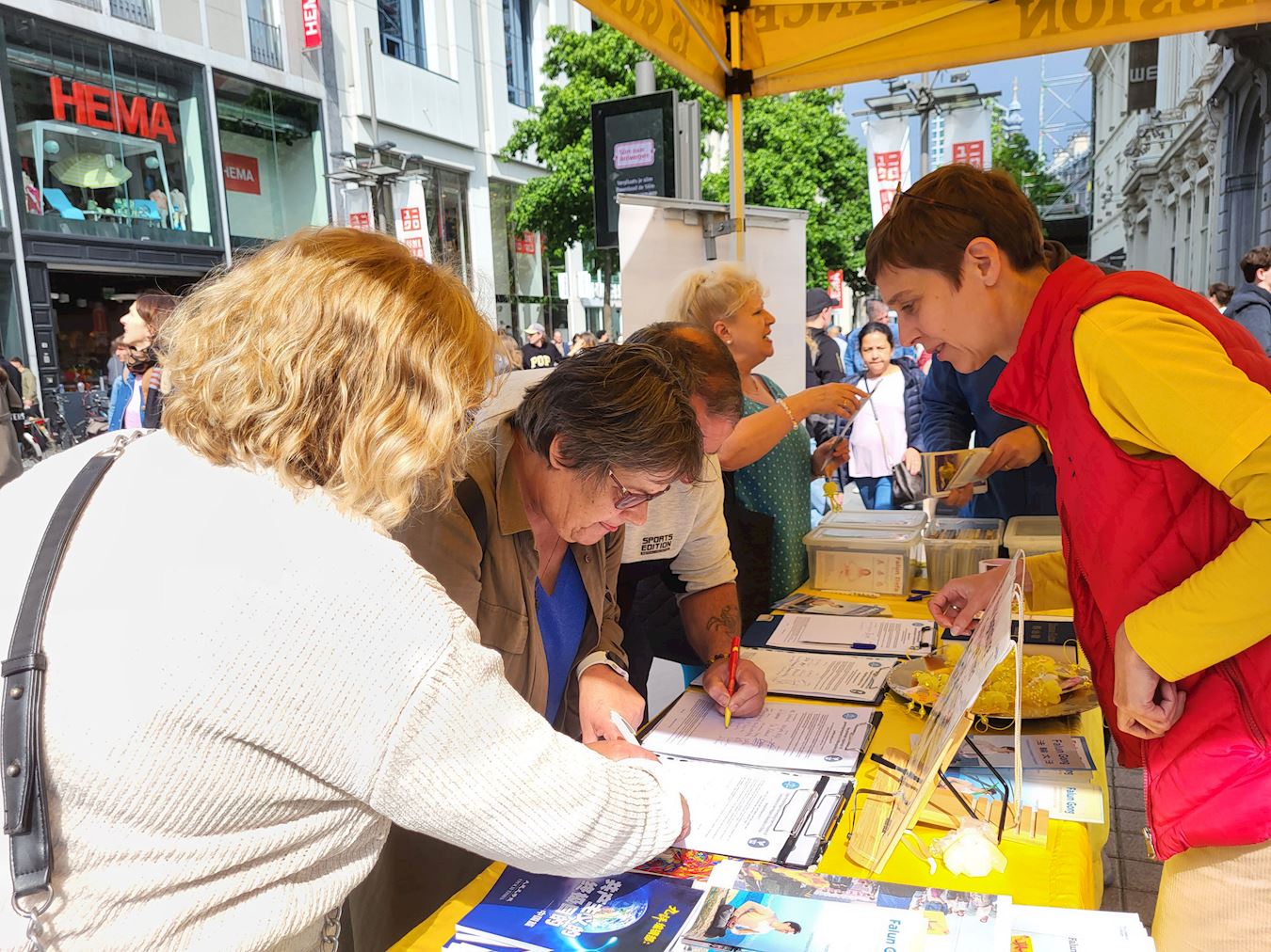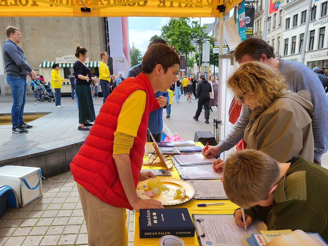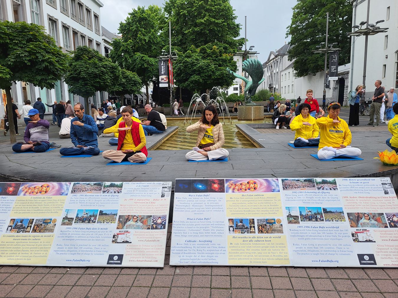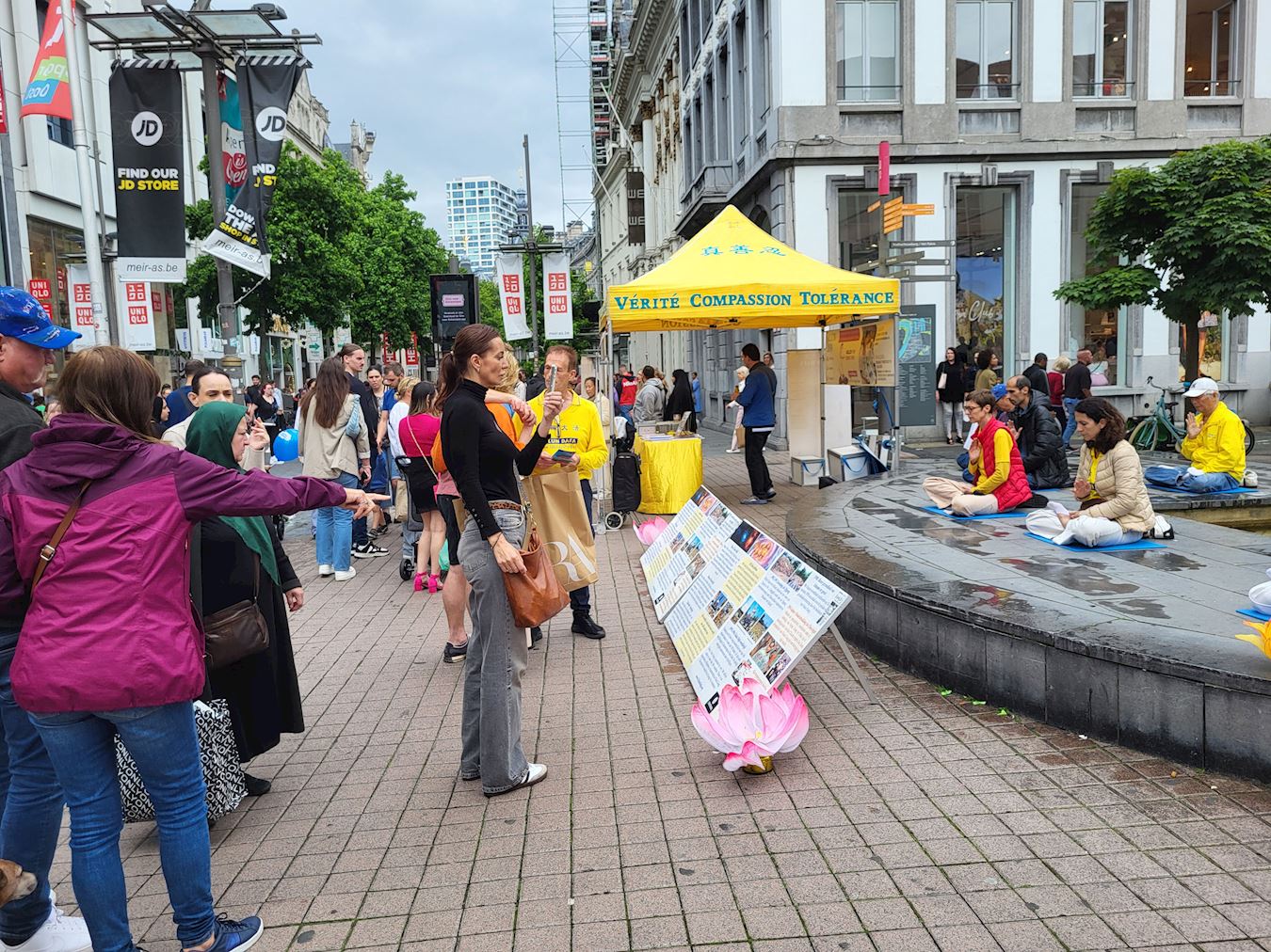 二零二四年六月十五日,学员们再次来到这里,向市民演示功法、发真相资料、并讲述法轮大法的美好与中共迫害法轮功的真相。善良的民众纷纷在呼吁停止迫害法轮功的请愿书上签名,他们对法轮功真、善、忍的原则产生共鸣,并强烈反对中共迫害(真善忍)价值。还有人说,法轮功的原则是善良的,能解决当今人类正面临的动荡。