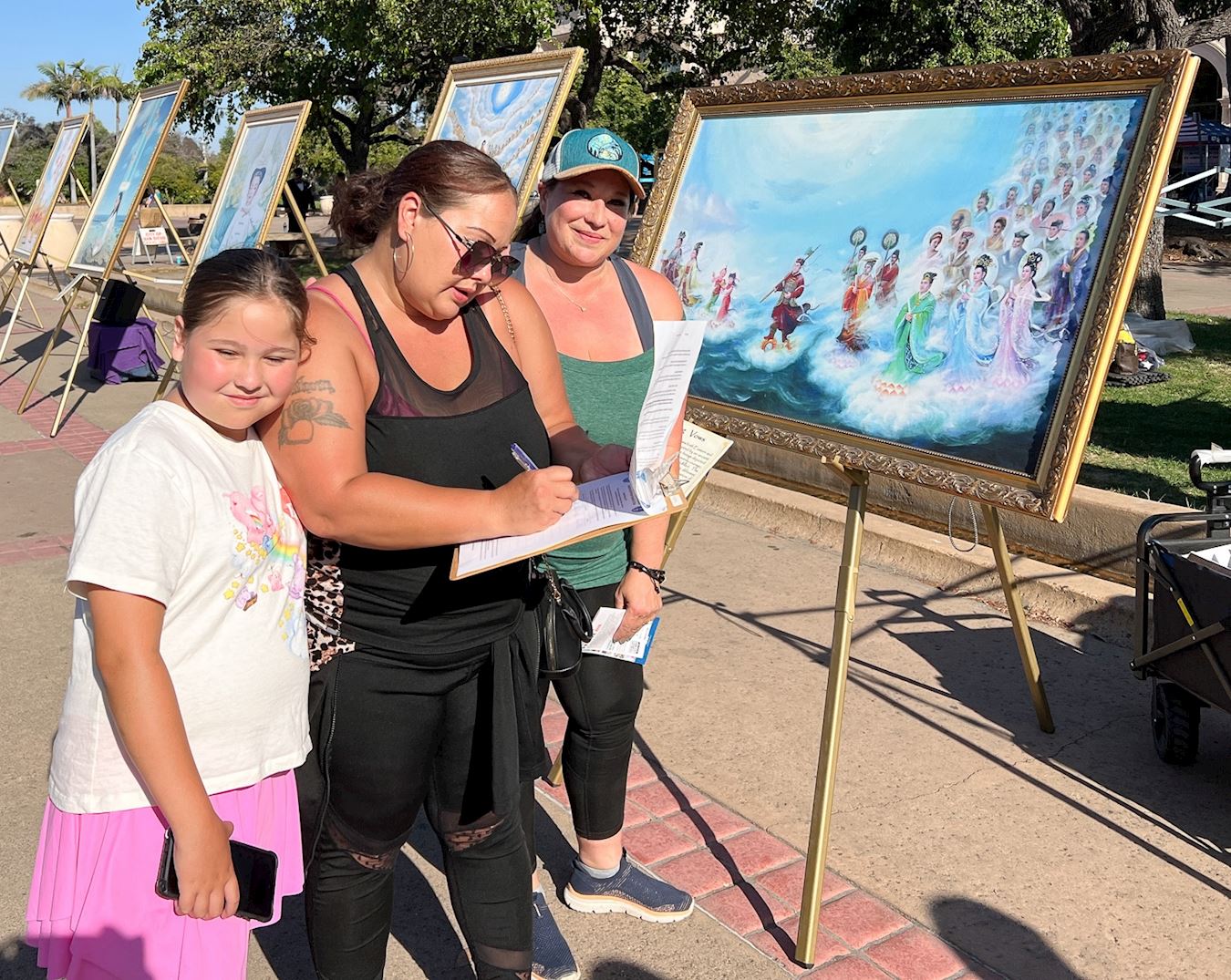 从亚利桑那州来旅游的高中毕业生格温迪林·阮(Gwendylin Nguyen)和杰琳·罗德里格斯(Jaylyn Rodriguez)也在画展前驻足。格温迪林说:“画展表达了很多内容,令人感动,展现了很重要的信息,非常好。”她并自我介绍,自己是越南裔和华裔后代,在家里听说了一些关于发生在中国的事,和有关异议人士被中共关押的事。看到画展,了解了中共对法轮功的迫害,她就把这些事都能联系在一起了。