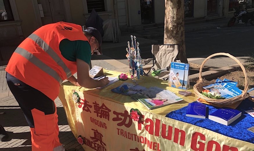 在真相资讯台旁,法轮功学员们向行人介绍法轮功(亦称法轮大法)。同时,揭露自一九九九年七月起,数以百万计中国法轮功学员因为修炼真、善、忍,他们的信仰自由和基本权利遭到剥夺。这些修炼人被拘捕,送往劳改营,有的甚至在遭受骇人听闻的酷刑后惨遭杀害。