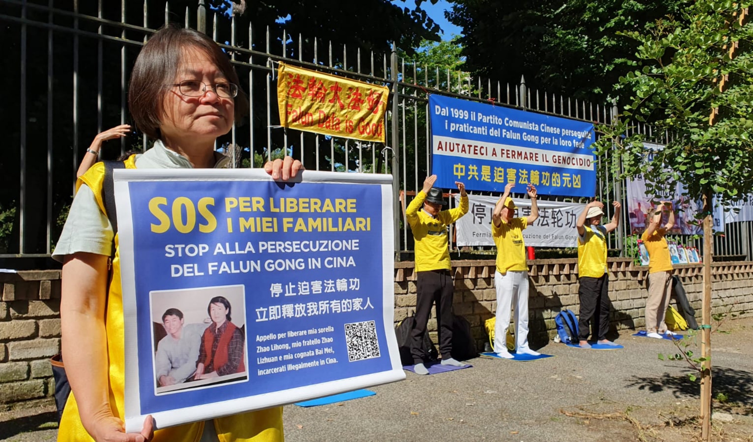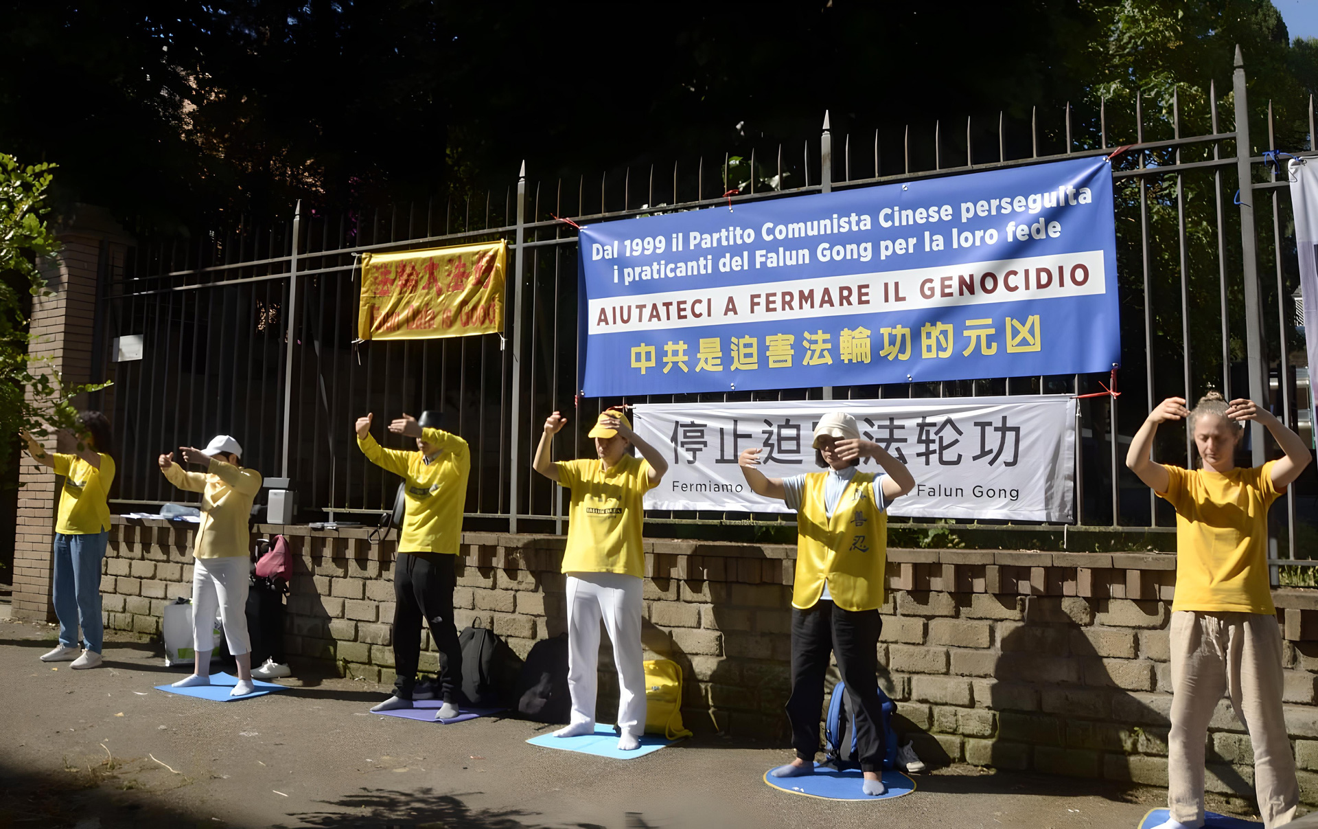 当天,学员们在使馆前挂上揭露中共迫害法轮功学员的横幅,呼吁立即释放被非法抓捕、关押的法轮功学员。他们紧急敦促山东省公检法人员,无条件释放法轮功学员赵李红、赵李专、白玫,并呼吁意大利政府帮助营救在中国被迫害的法轮功学员。