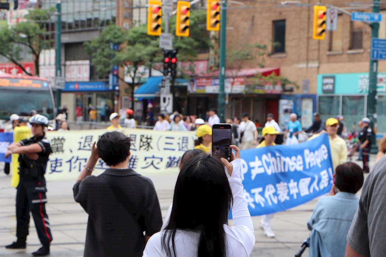 林女士来自福建,她在观看游行队伍时,学员上前跟她说:“能来到海外,真是福份。在国外能看到这种和平的反迫害游行,在国内是看不到的。”林女士回答说:“是啊,国内只有造谣。”学员接着告诉她中共活摘器官的罪行,并劝她三:退.(退出中共党、团、队)保平安,林女士表示认可,并用“平安”为化名退出之前加入的共青团和少先队。