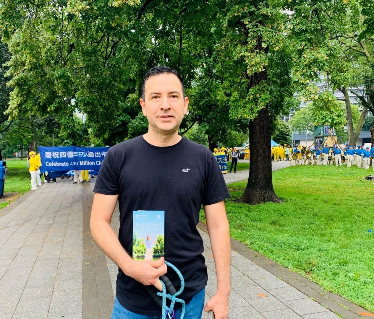 贡萨洛(Gonzalo)来自秘鲁,现居在加拿大。他散步经过学员集会的公园时,接过了学员递来的传单。学员向他介绍这次游行是为了庆祝四亿三千万中国人退出中共党、团、队组织,并告诉他大法的相关真相。贡萨洛对学员说:“我之前对中共的了解不多,所以你们的讲解很有意义。中共不允许人们有信仰和思想自由,它就是个独裁政府。”