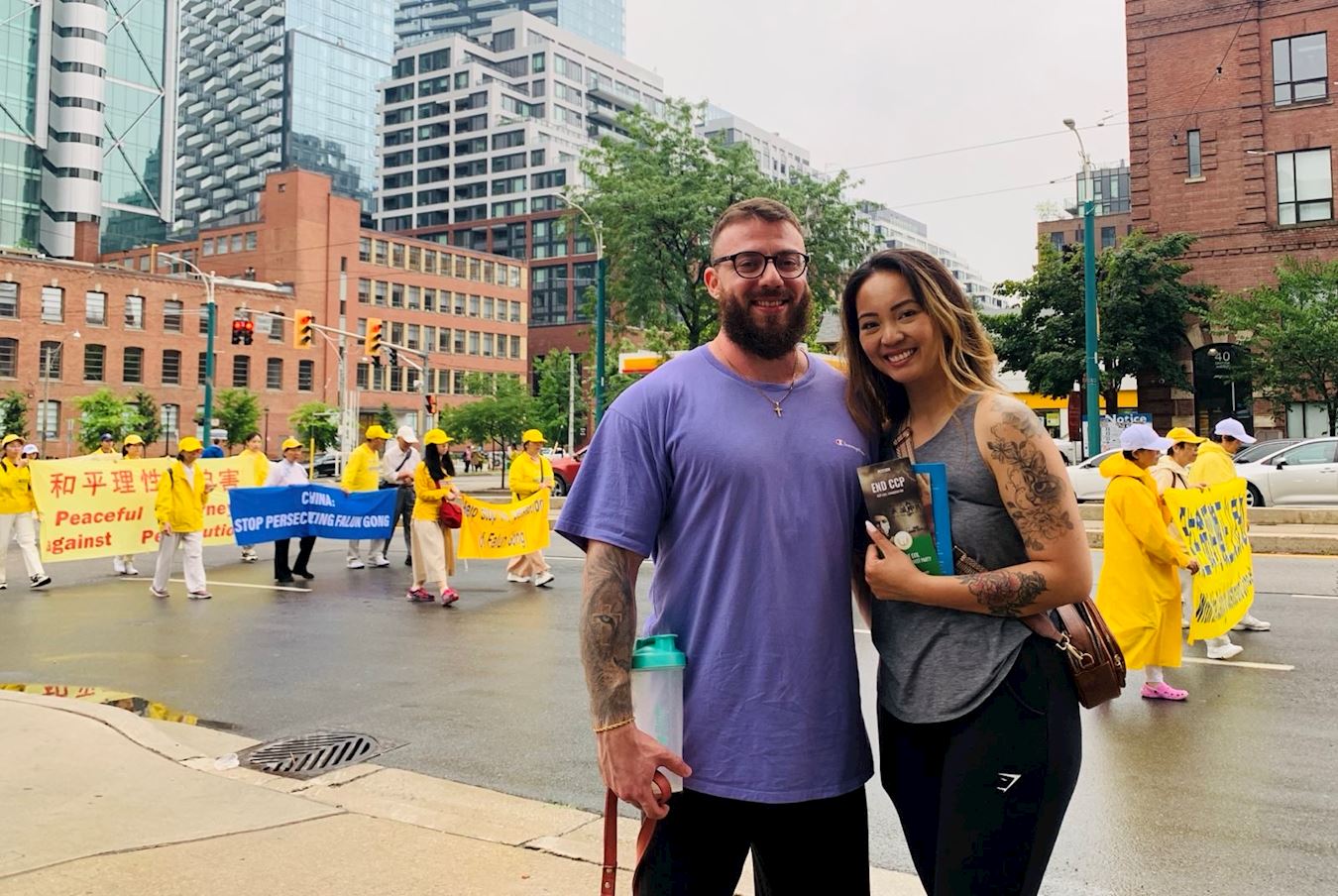 麦隆(Mairon)和乔安娜(Joanna )出门散步时,被游行的队伍所吸引。学员于是递给他们真相传单,并告诉他们游行的信息。乔安娜说:“学员的介绍帮助我了解到法轮大法是什么,以及中共在历史上犯了什么罪行,很高兴能了解到你们在为正义而努力。”麦隆补充道:“尤其在当今社会,颠倒黑白的事情屡屡发生,而你们愿意站出来亲自告诉世人真相,让正义得以伸张,令我耳目一新。”