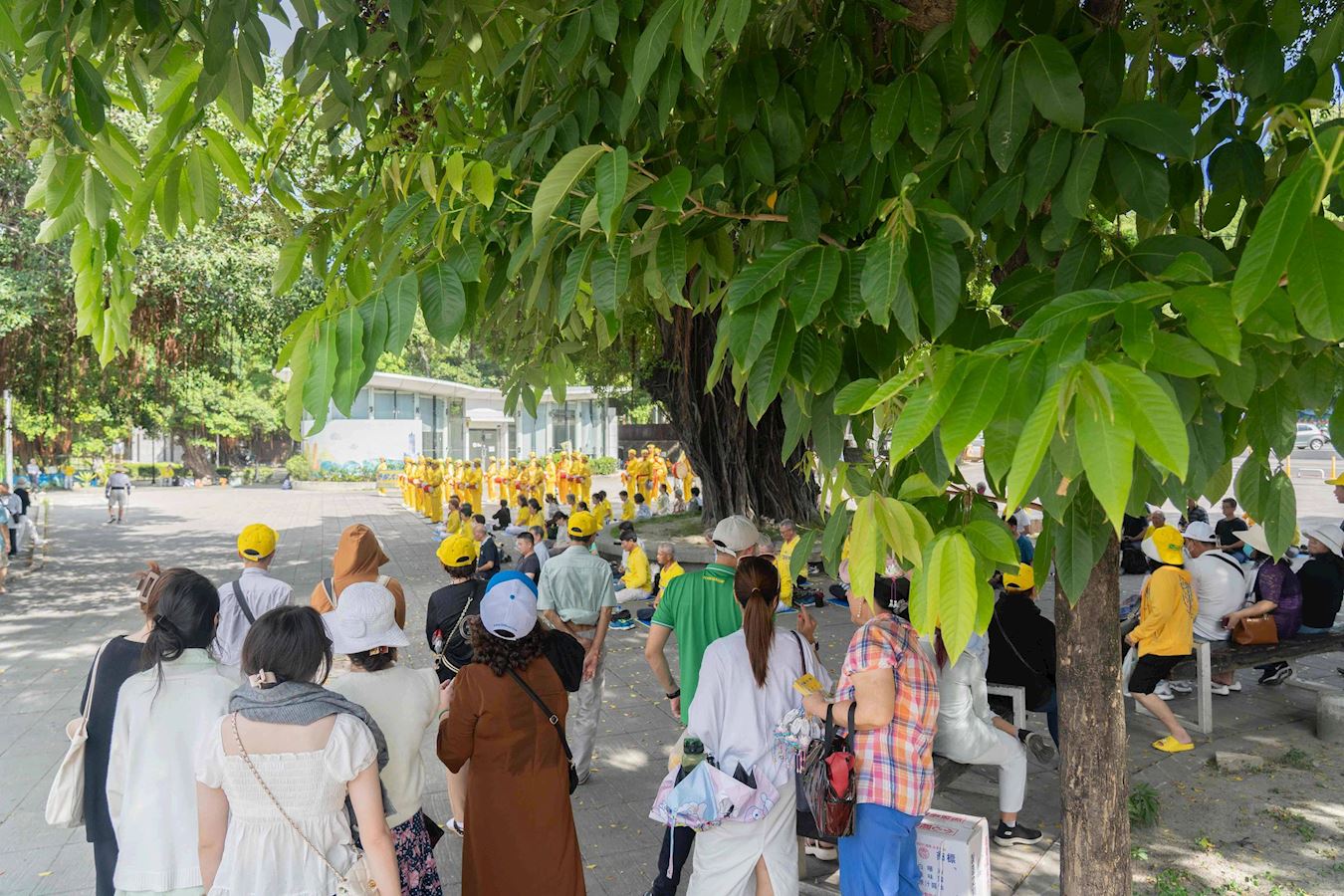 盛夏艳阳高照,炼功音乐悠扬放送,在一旁歇凉的越南游客,顺手接下了越文版大法真相传单。不久,来了十多位日本观光客,在台湾领队的带领下,大家齐聚法轮功展板前观看真相,人手一份真相传单,口中跟着念诵:“法轮大法好!”此时,家住附近、年逾八旬的谢爷爷,听过法轮功真相后,也请学员帮忙写下:“法轮大法好”。他表示,要带回去给孙子看。