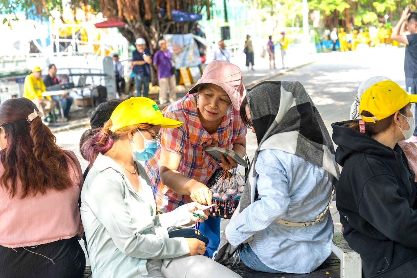 ![]() 图5~7:越南游客被祥和的炼功画面吸引,驻足观看,或接过学员所派发的真相传单,聆听法轮功的真相。 |
