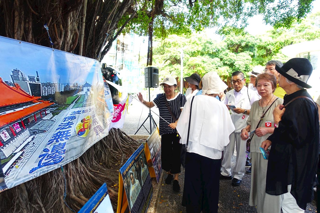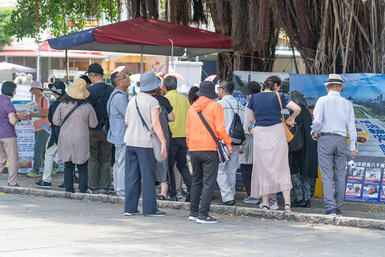 ![]() 图8~9:日本游客在台湾领队的带领下,观看真相展板,了解法轮功的真相。 |