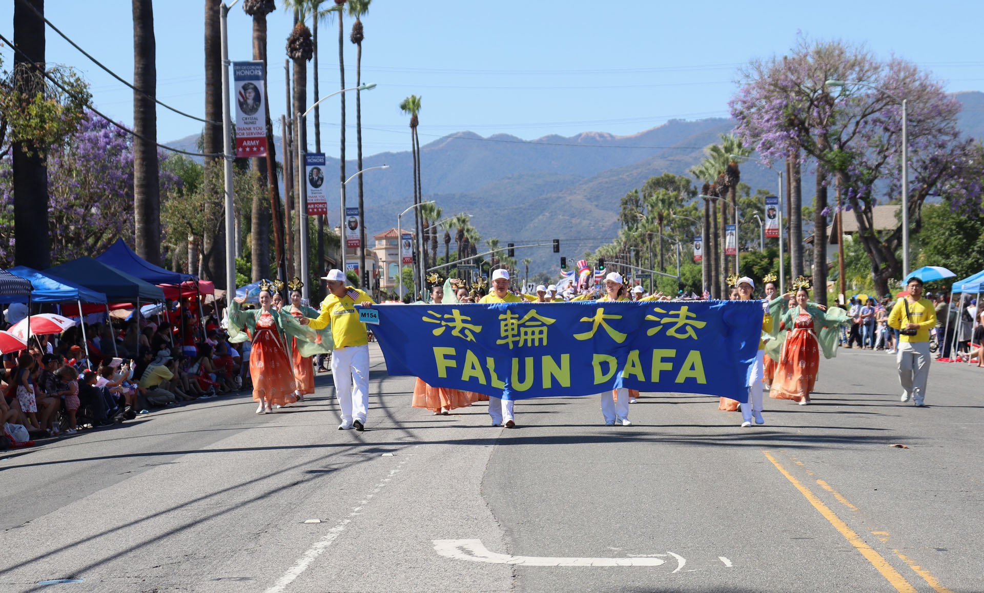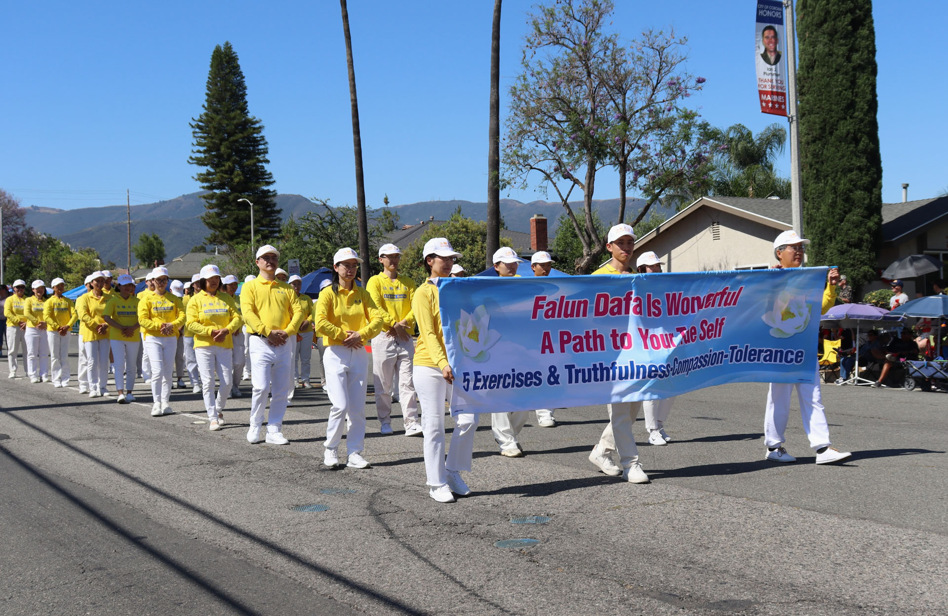 法轮大法团队今年是第二次参加游行,仙女队和功法演示队伍走过时给人们带来一片祥和。