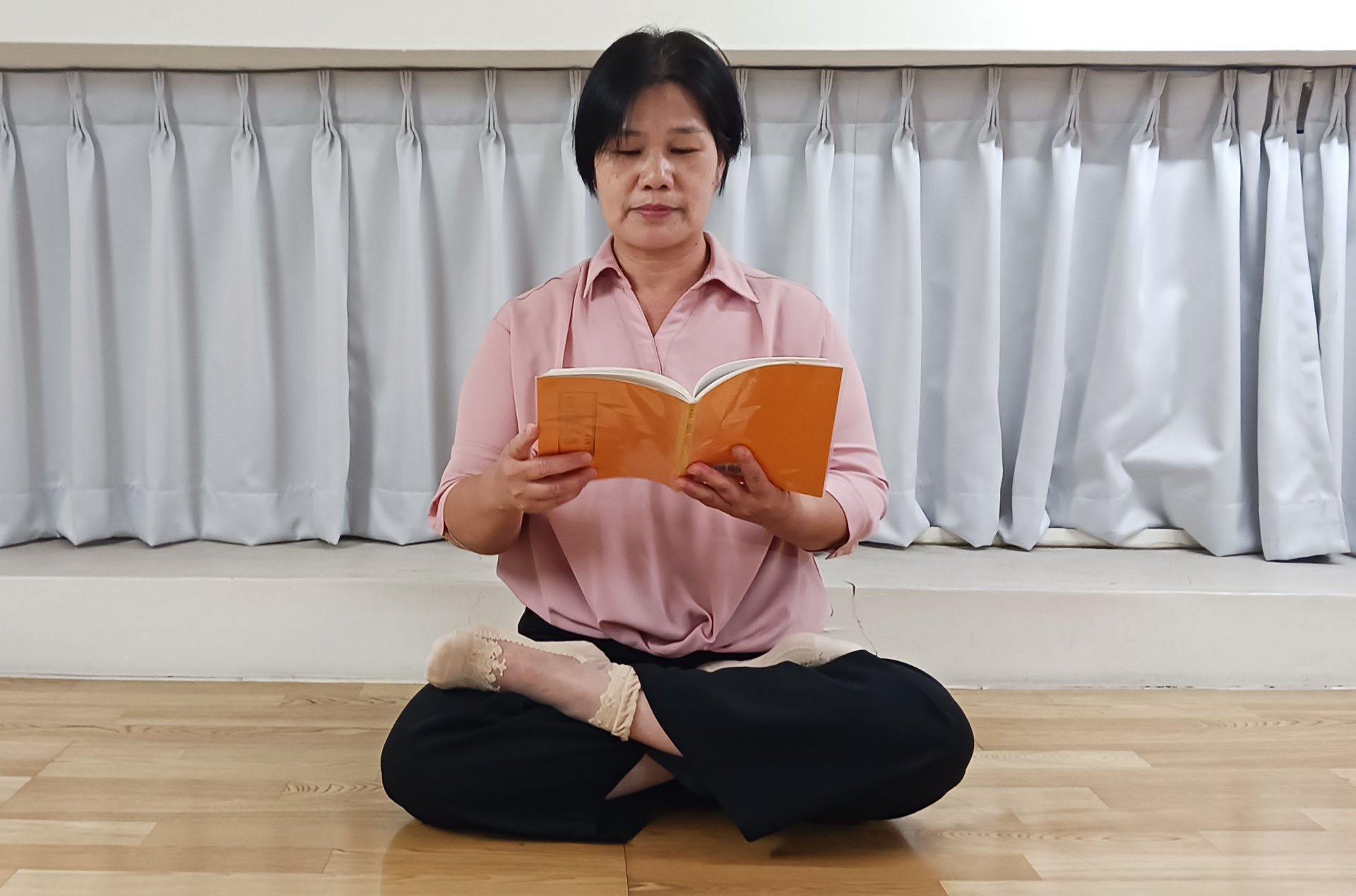 ![]() 图1:巧芳正在阅读《转法轮》 |