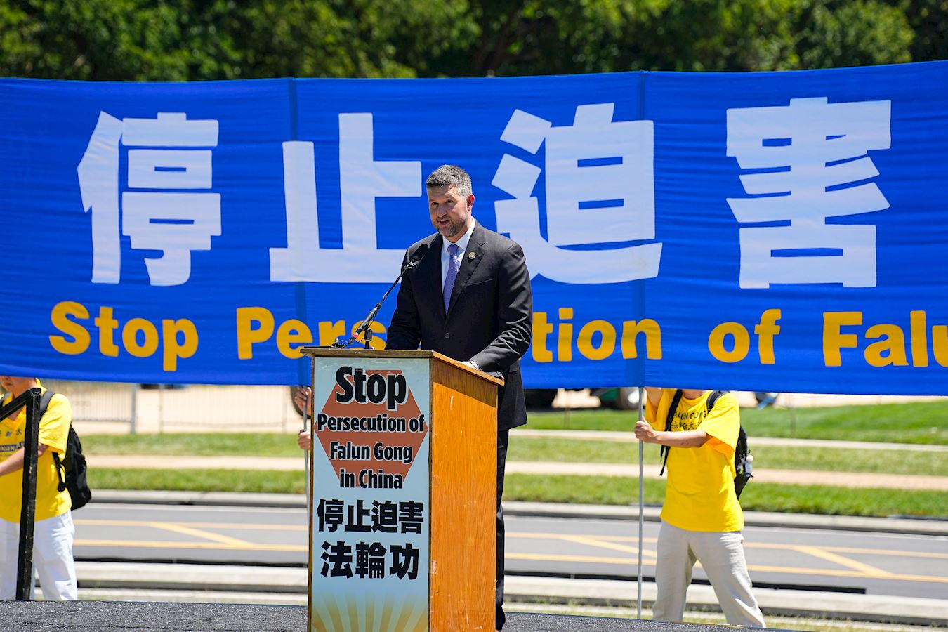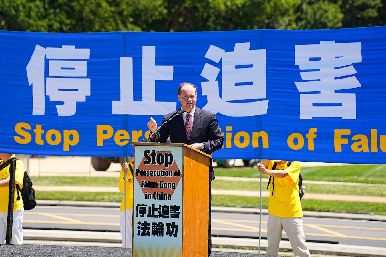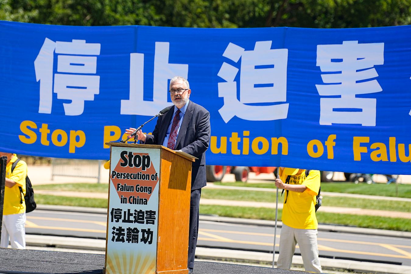 “二十五年来,法轮功遭受了各种可以想象的苦难,我们与你们站在一起。我们与你们的社区站在一起。我们呼吁结束这种镇压,结束酷刑,结束监禁,为法轮功和中国境内所有宗教团体开启一个自由的新时代。”