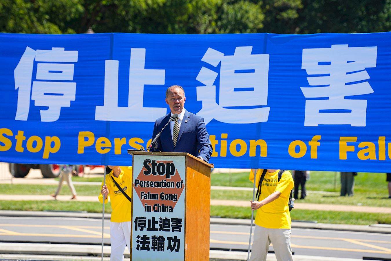 “今天,我们在此明确宣布,美国两党与法轮功团体站在一起,捍卫自由,捍卫宗教自由,并且反对中共对宗教自由的直接侵犯。”