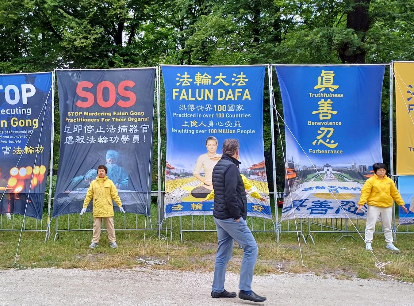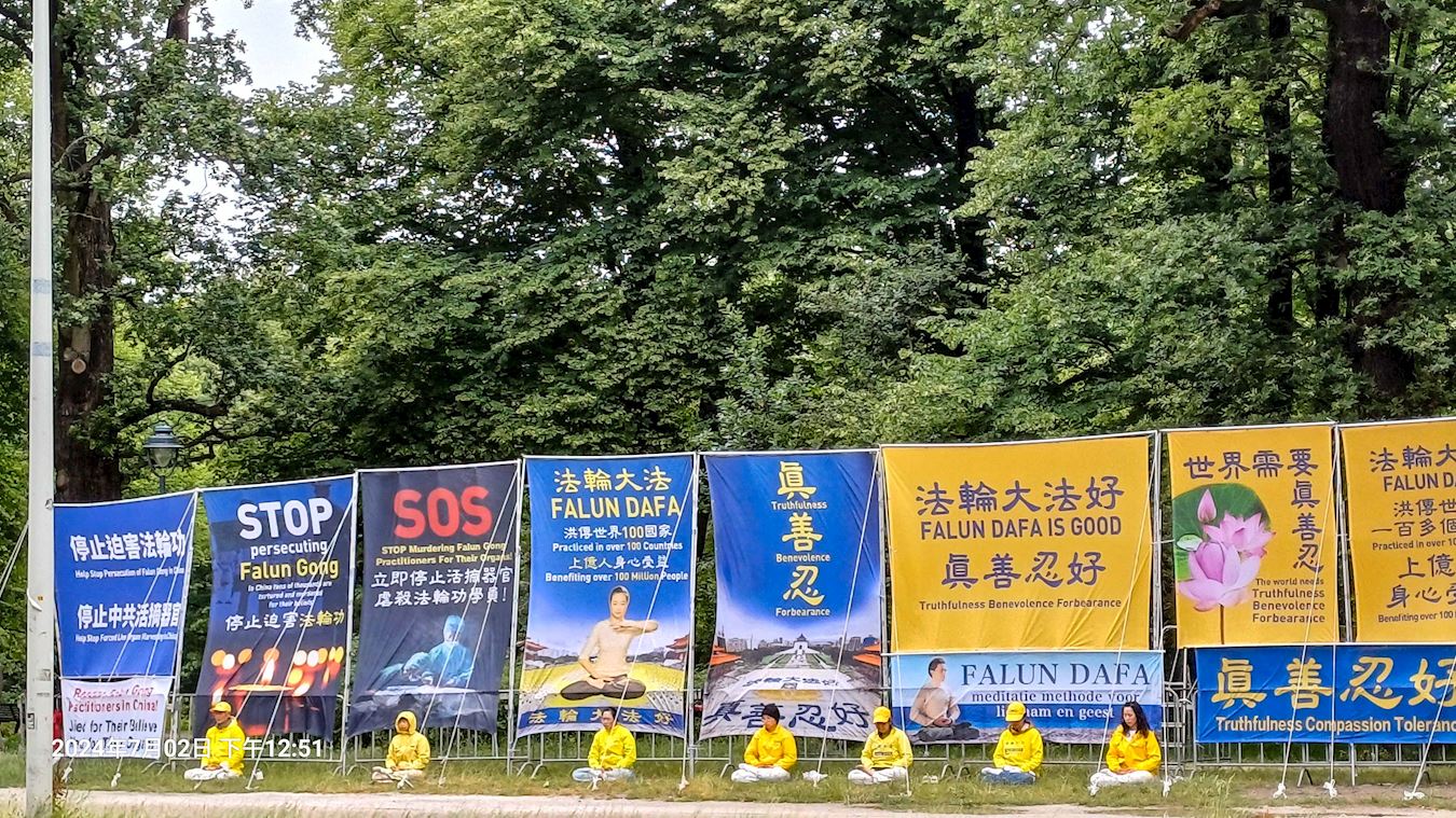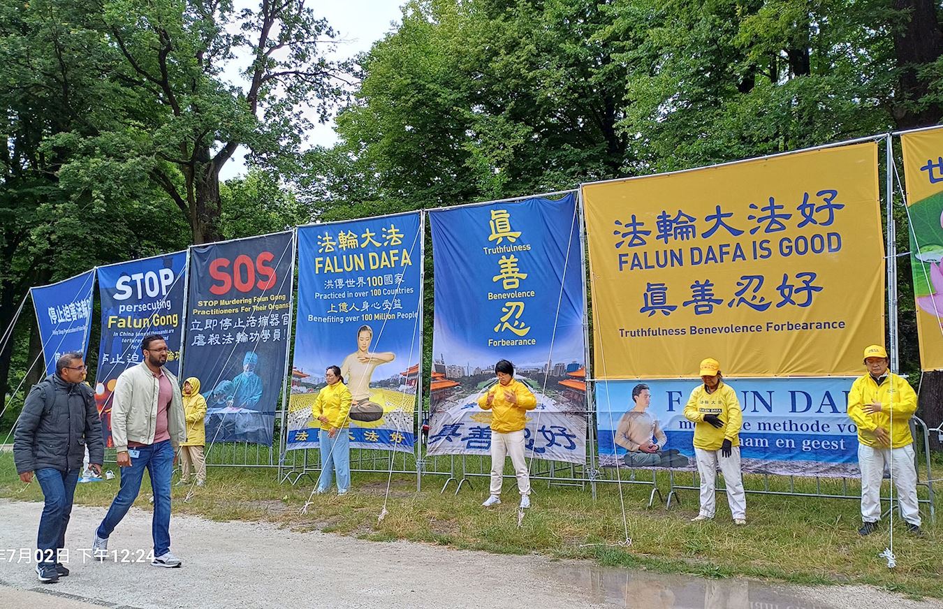 六月二十六日至二十八日、七月二日至四日两周的工作日,学员在现场竖起巨大的横幅:“停止迫害法轮功”、“停止活摘器官虐杀法轮功学员!”“法轮大法弘传世界一百多个国家和地区,上亿人身心受益。”以及法轮大法法理“真、善、忍”,传达法轮大法的美好信息。