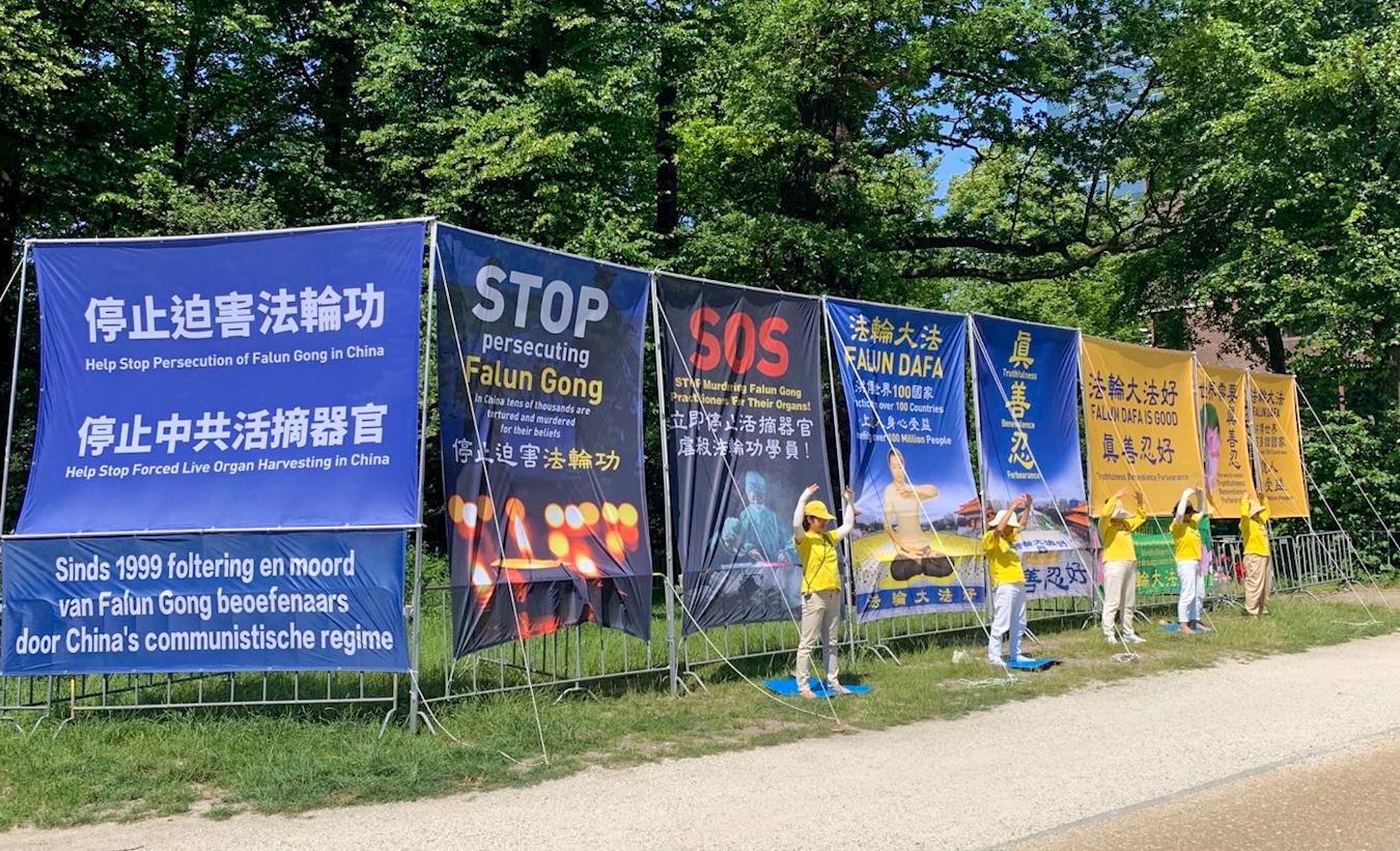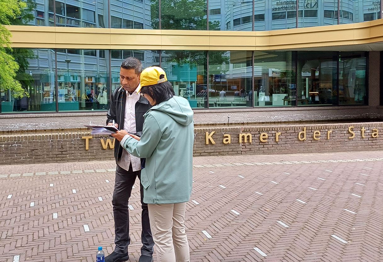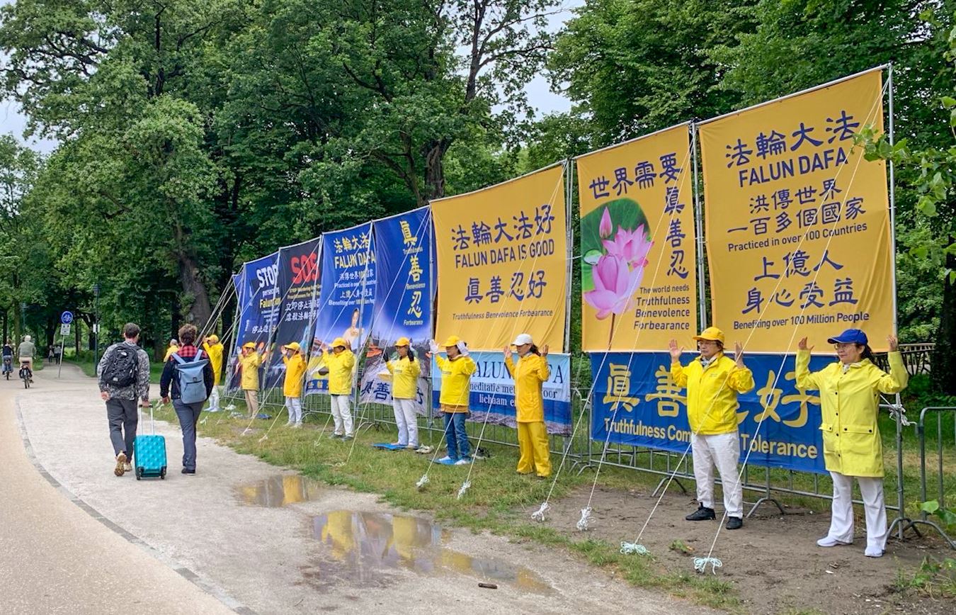活动开始第一周艳阳高照,气温高达二十九度,第二周持续阴雨气温低至十七度,无论天气如何变化,学员们依然坚持在国会大厦街对面展示平静祥和的法轮功功法,对过往的行人派发真相传单。向市民介绍法轮功、并向议员揭露中共对法轮功学员的残酷迫害的真实情况。得到荷兰部份政要的关注和路人的支持。