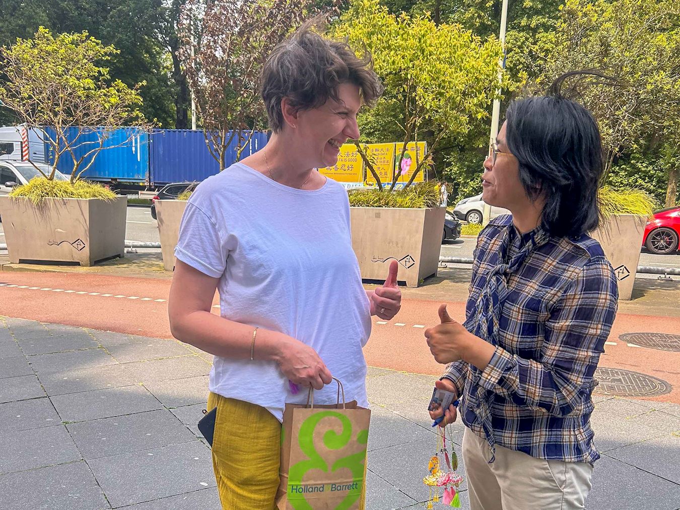 一位从事志愿服务工作的女士从法轮功学员的炼功队伍前走过,了解到中国共产党对法轮功学员的迫害长达二十五年还在持续发生,她认为真、善、忍信仰值得尊重,中共活摘器官的行径太邪恶,她在反活摘器官的征签表上签名,高兴的收下学员递送她的真相传单。