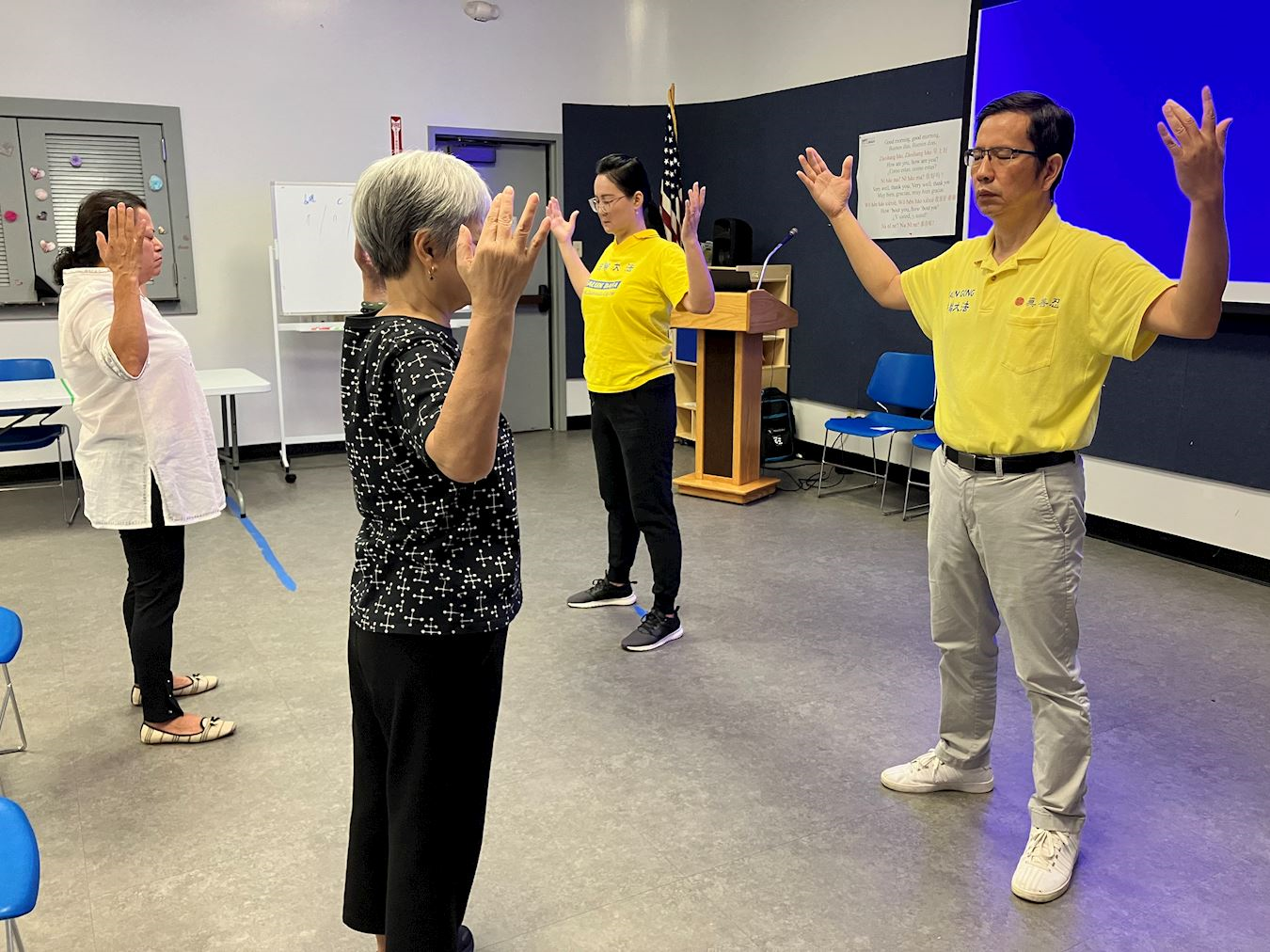 当天,詹妮弗认真地听讲,学炼着法轮功五套功法,对于难度较大的第二和第五套功法,也坚持下来了。教功班结束后,她询问如何才能买到书,学员告诉她法轮大法的网站。詹妮弗表示回去后会继续跟网上的录像学炼,即便不能每天五套功法一步到位,也会尽力而为。