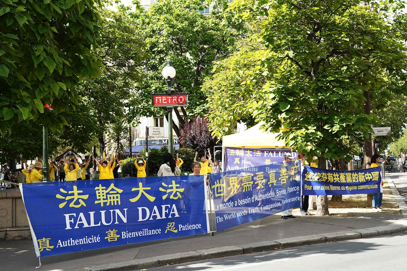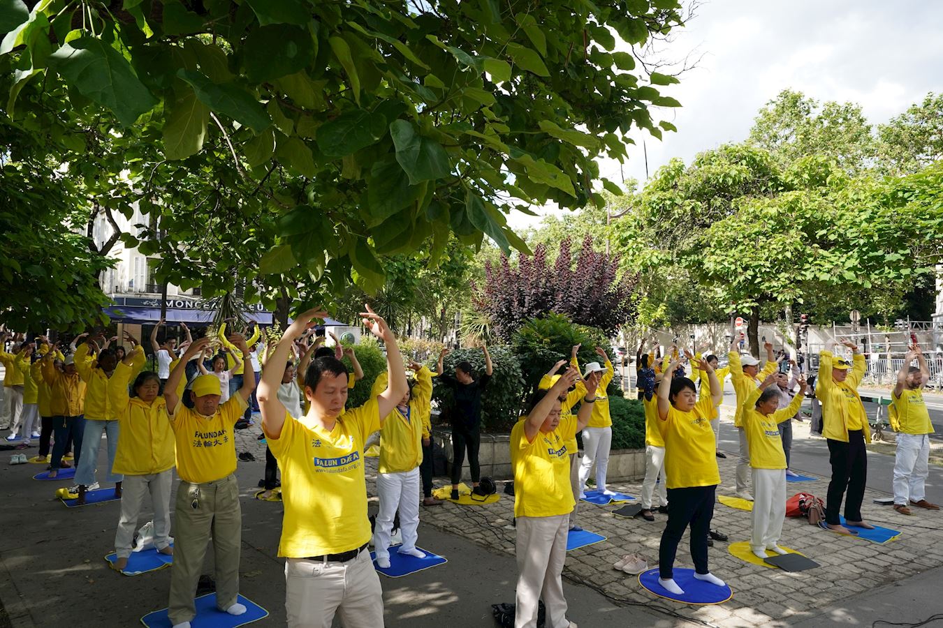 ![]() 图1~2:二零二四年七月十三日,法国巴黎部分法轮功学员在反迫害二十五年之际,在中国驻法国大使馆附近的广场集会现场 |