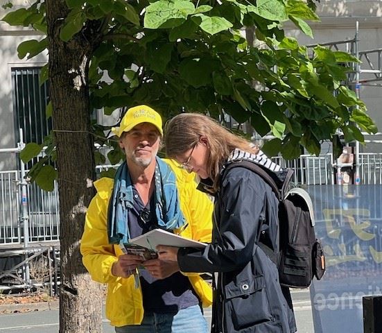 诺拉(Nora)女士在今天的活动现场驻足了很久。一直在倾听法轮功学员的现场讲真相。