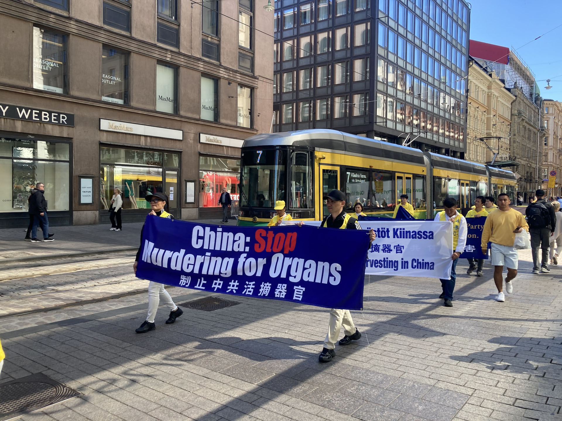 当天的游行队伍分成三个不同的主题,第一部分介绍法轮大法,主要以“法轮大法在芬兰”,“真善忍”等横幅组成。第二部份揭露中共迫害法轮功,横幅上展示了关于停止活摘器官以及悼念被中共迫害致死的法轮功学员遗像组成。第三部份是呼吁解体中共,停止迫害。