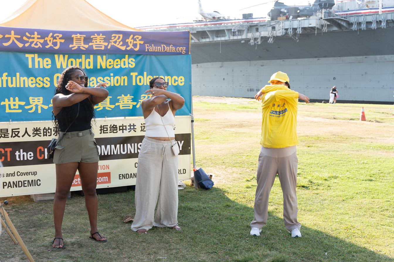 来自北加州的珍妮(Jennie)和莱安德拉(Leandra)说,她们被法轮功学员集体炼功的场景吸引,想要学功。在学炼了一会儿后,珍妮说:“这是一种我从来没有见过的打坐修炼方式,所以我决定亲自试一下,我只做了几分钟,就有一种非常平和及宁静的感觉,我也感觉到一种喜悦感,我能体验到能量在我身体里运行。说实在的,过程中,我在努力控制我自己不要哭,因为从我内心里,涌出一种感动。”她表示,回去一定会对法轮大法做更多了解,“因为我能真实地感受到能量和喜悦。”