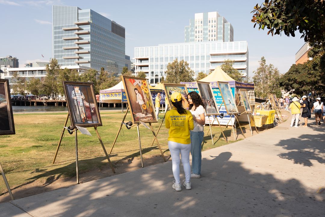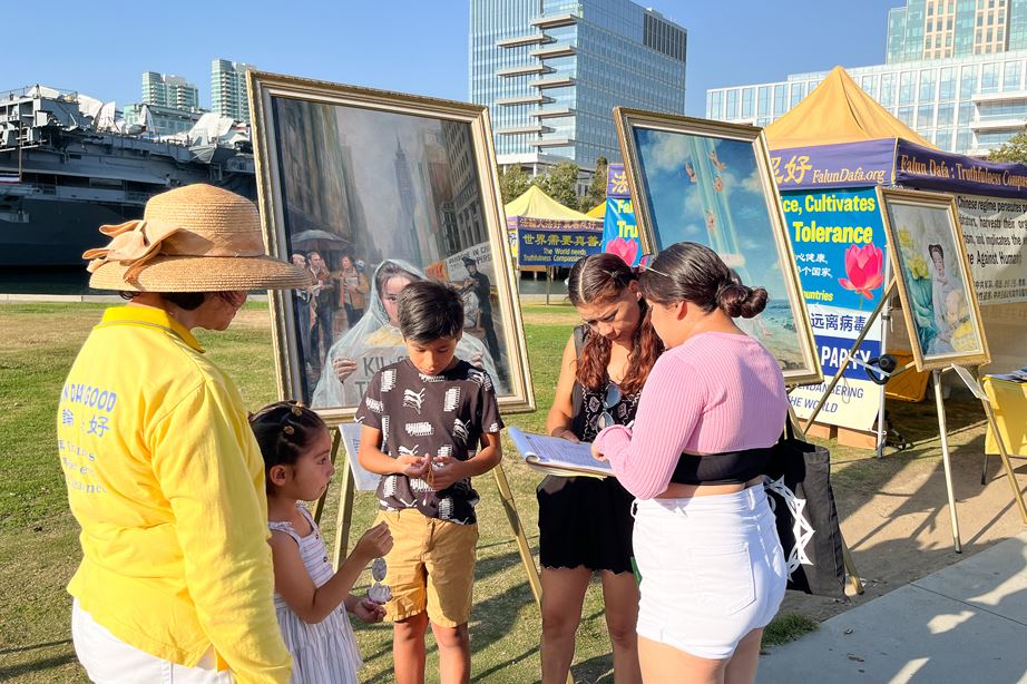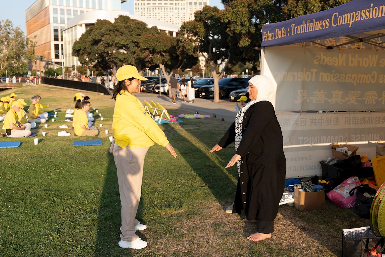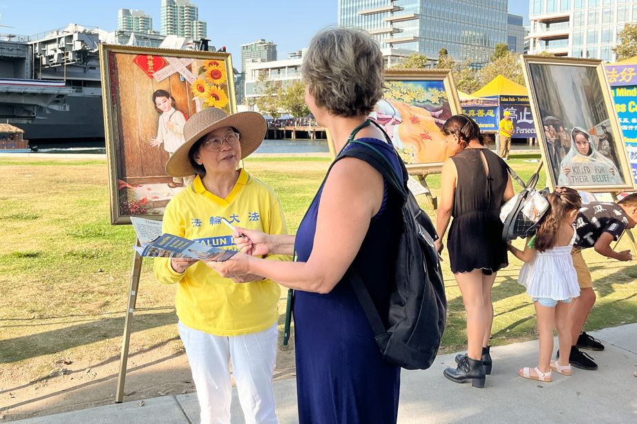 来自圣地亚哥的索娜·巴格达萨燕(Sona Baghdasaryan)介绍自己是小提琴手和音乐指挥。她看到身着黄色T-恤衫的法轮功学员在绿草坪上炼功后说:“我非常喜欢他们的黄衣服,在绿草地上,蓝色的海湾边,非常美。这是非常美的展示,非常好的地方,可以自由地表达。”