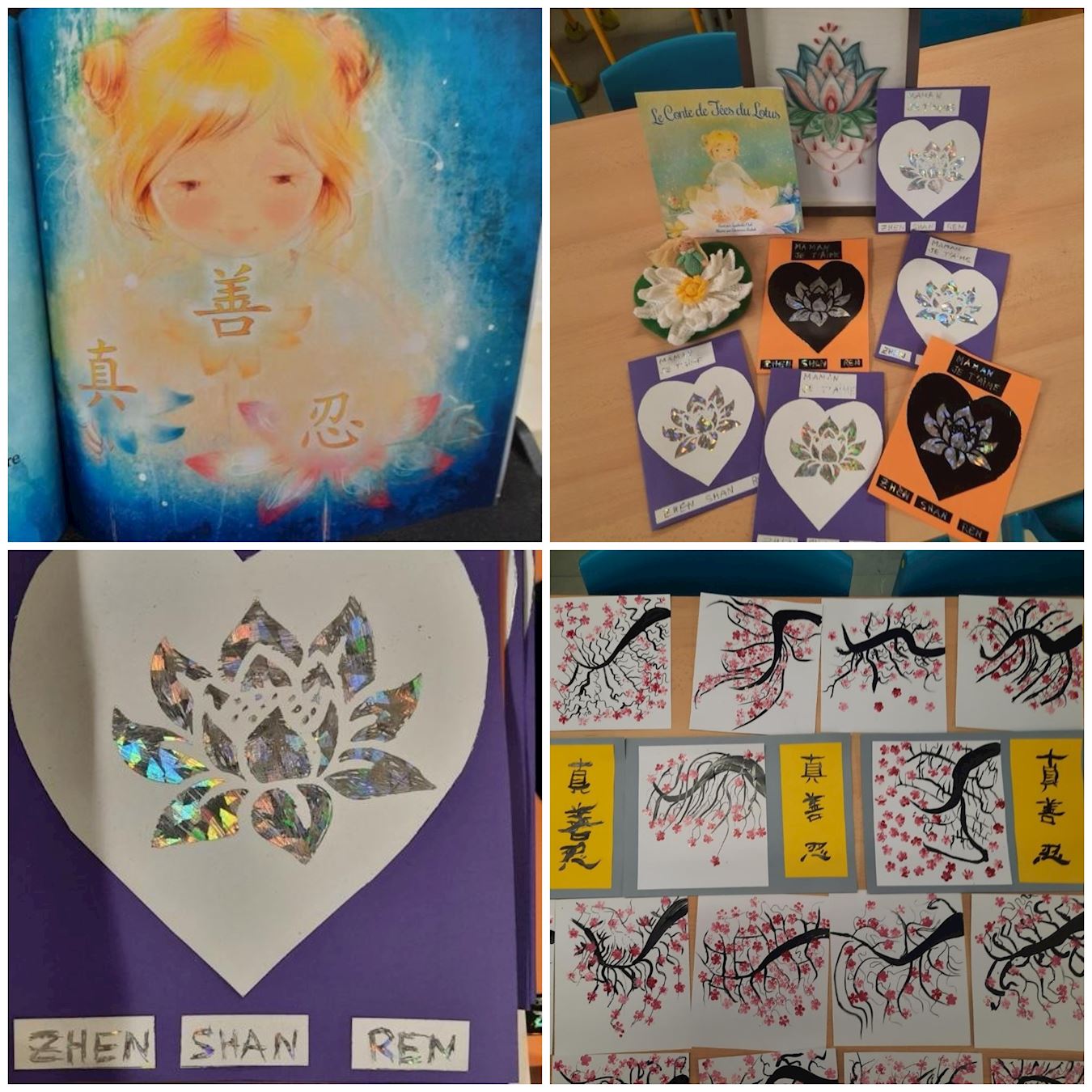 在课堂上,学生们首先看了《童话莲花》的故事。在《童话莲花》中,莲花象征着心中的纯净的美德,以及真、善、忍普世价值。学生们动手制作了很多种莲花的版本,很多学生直接把中文“真、善、忍”字样写在了礼物上。他们还写道: