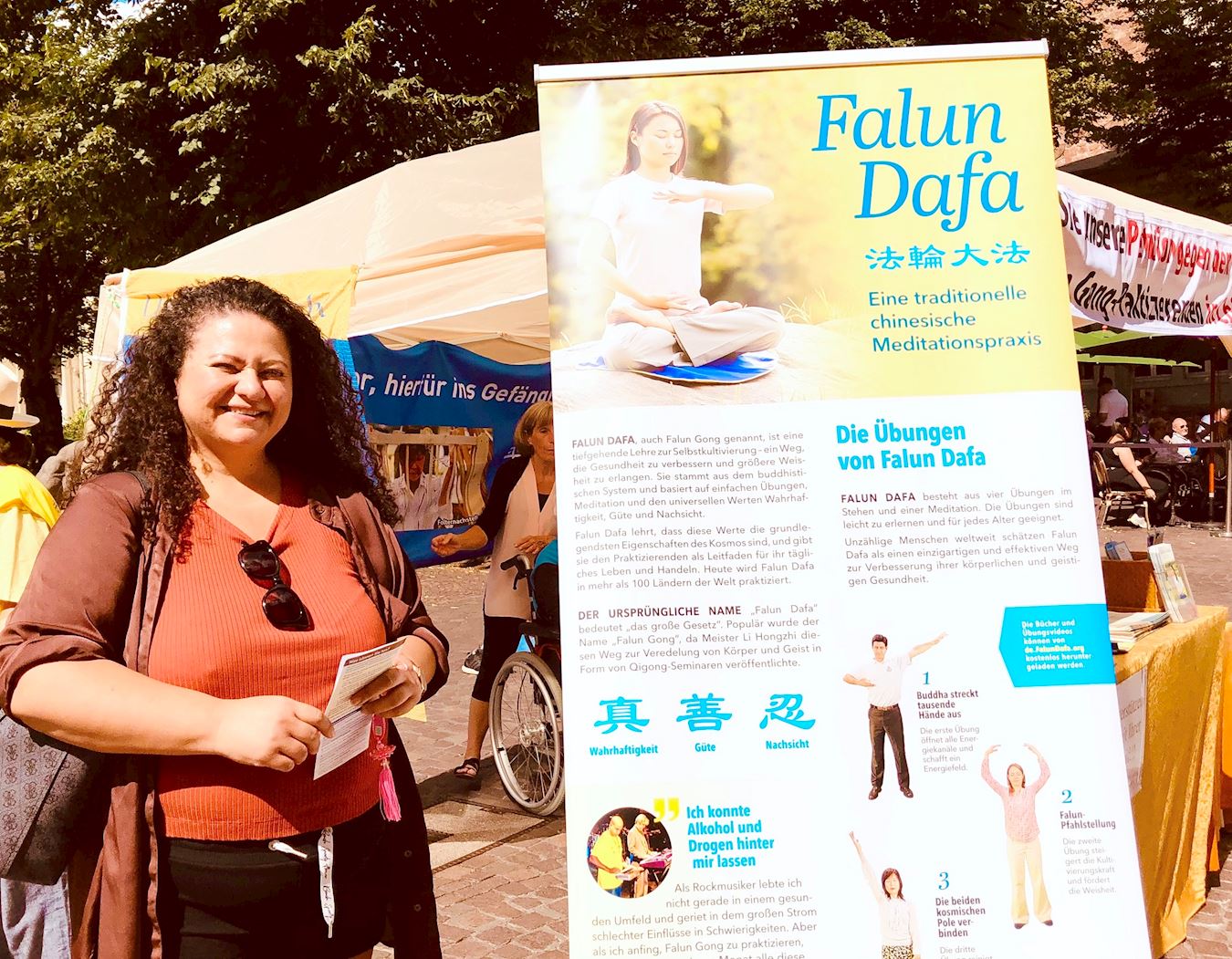 莫妮卡静静地观看法轮功学员展示功法以及整齐摆放在真相展位一侧地面上的各种有关中共迫害法轮功学员的酷刑示意图。之后,她在征签反迫害表格上签名。