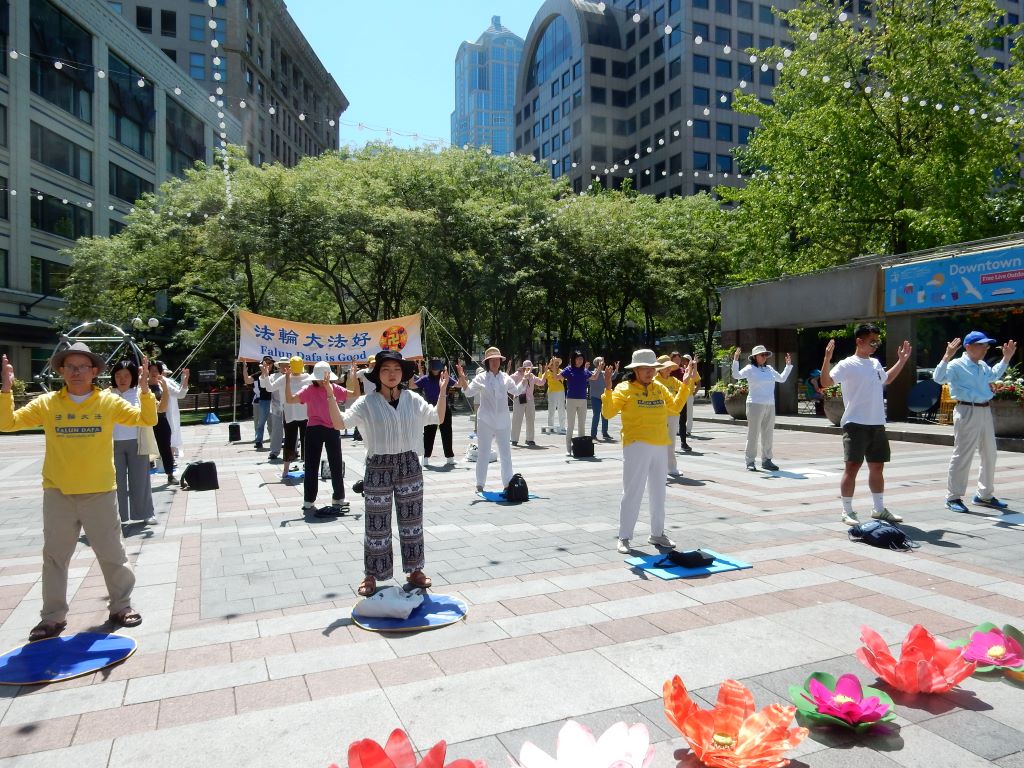![]() 图1:二零二四年七月十四日,西雅图部分法轮功学员来到西雅图市中心的西湖公园集会并集体炼功,向人们讲述和展示法轮大法的美好。图为法轮功学员在炼功。 |