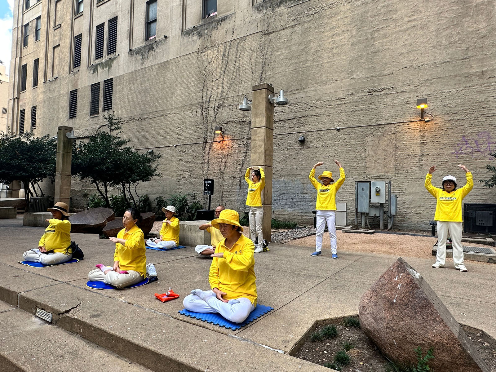 ![]() 图1~3:二零二四年七月十八日,达拉斯法轮功学员在飞马广场打横幅、炼功。 |