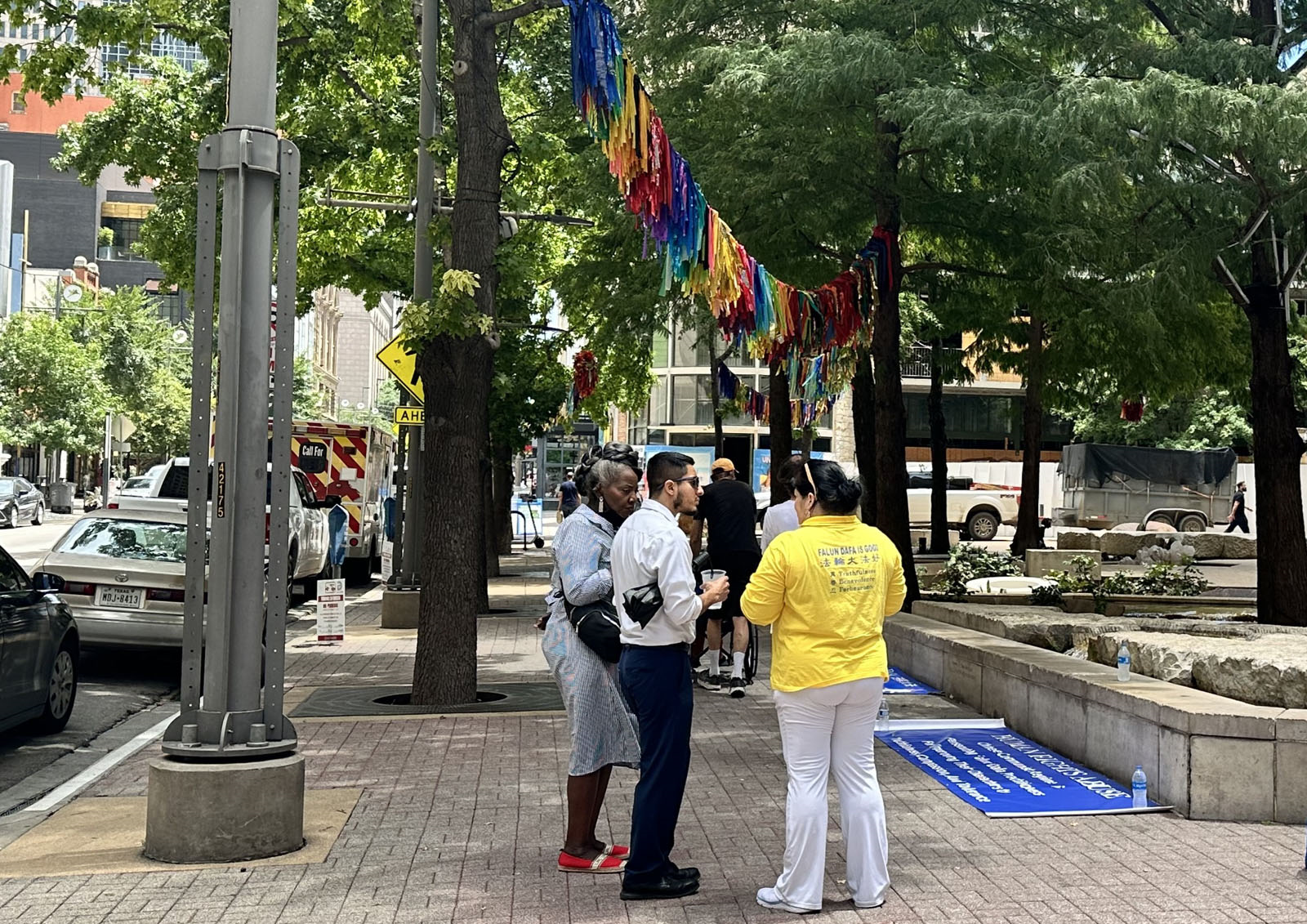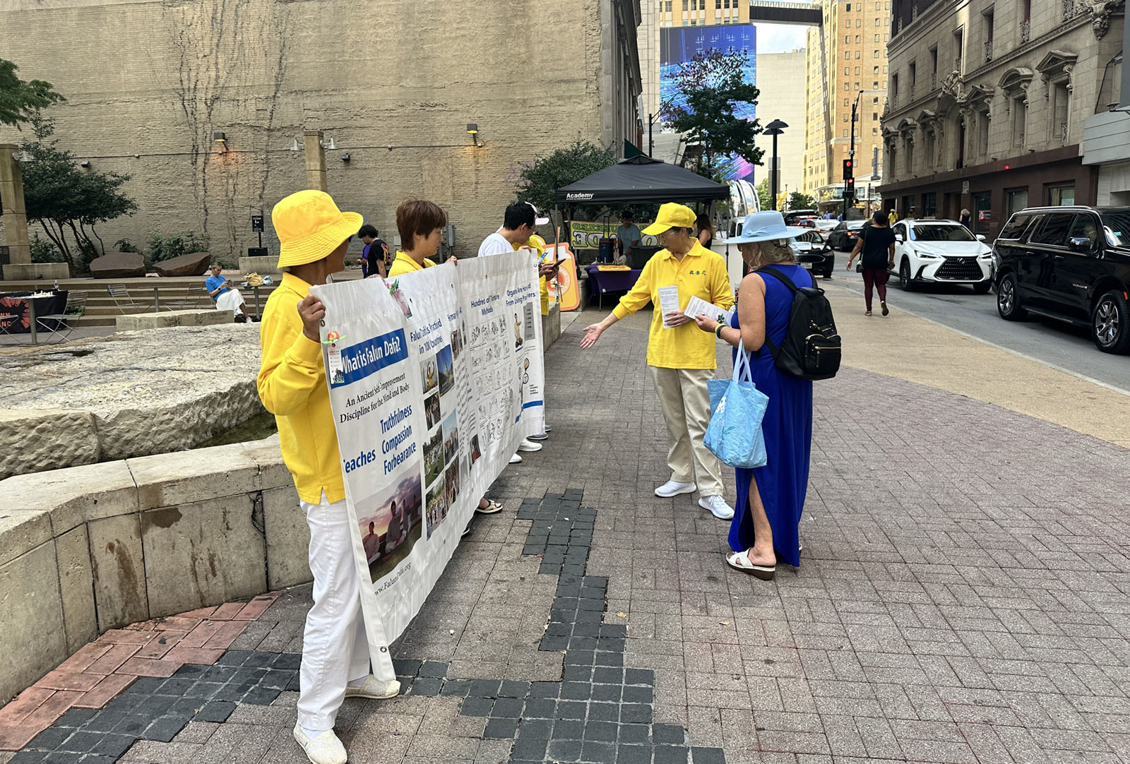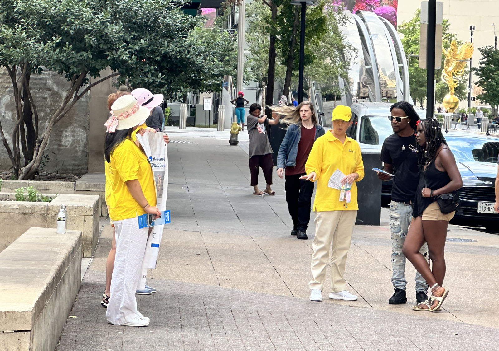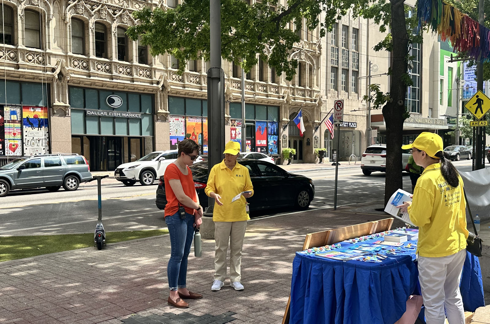 骑单车的扎克(Zack)在路口与法轮功学员相遇,他接过传单就看了起来,他对学员说他从加州搬来德州,就是想自己静下来弄明白一些事情。法轮功在大陆被迫害,他明白是中共的意识形态容不下法轮功信仰的真、善、忍的理念,可真、善、忍的理念是人应该遵循的呀,那中共就是邪恶的,而且共产主义正在影响着社会的方方面面,也不止是中国大陆。他说通过跟法轮功学员交谈,好象一下子明白了很多想不明白的事,思路一下开阔了。他说有机会他还要来了解更多。