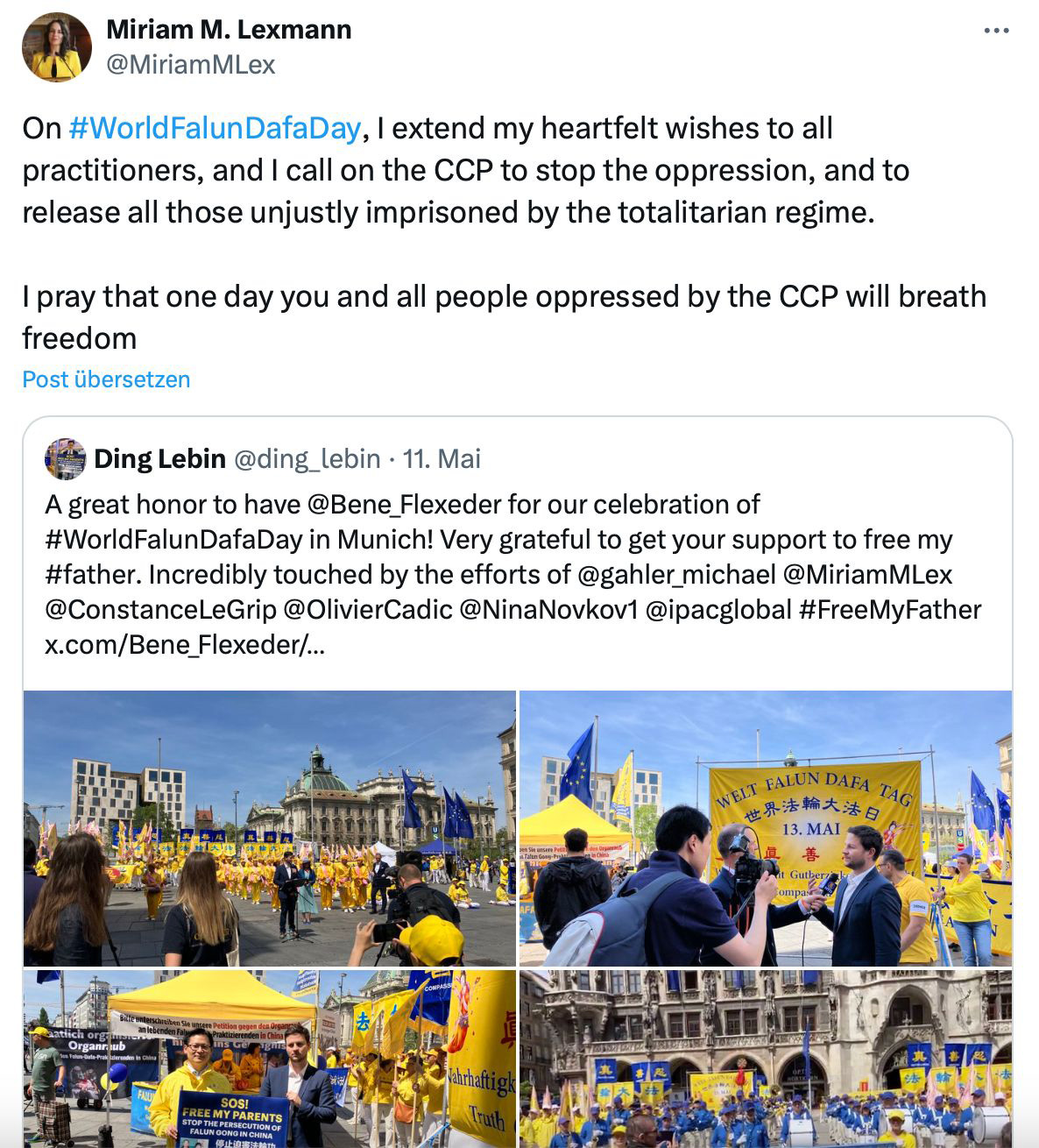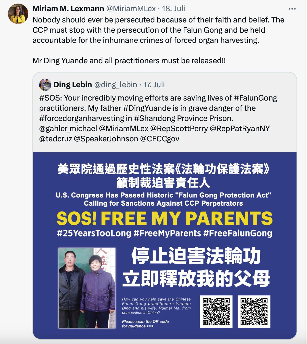 【明慧网二零二四年七月二十日】(明慧网欧洲记者站综合报道)在法轮功学员和平反迫害二十五周年之际,欧洲议会议员米里亚姆·莱克斯曼(Miriam Lexmann)在社交媒体平台上发文,强烈谴责中共活体摘取法轮功学员人体器官的反人类罪行,并要求中共立即释放所有法轮功学员。