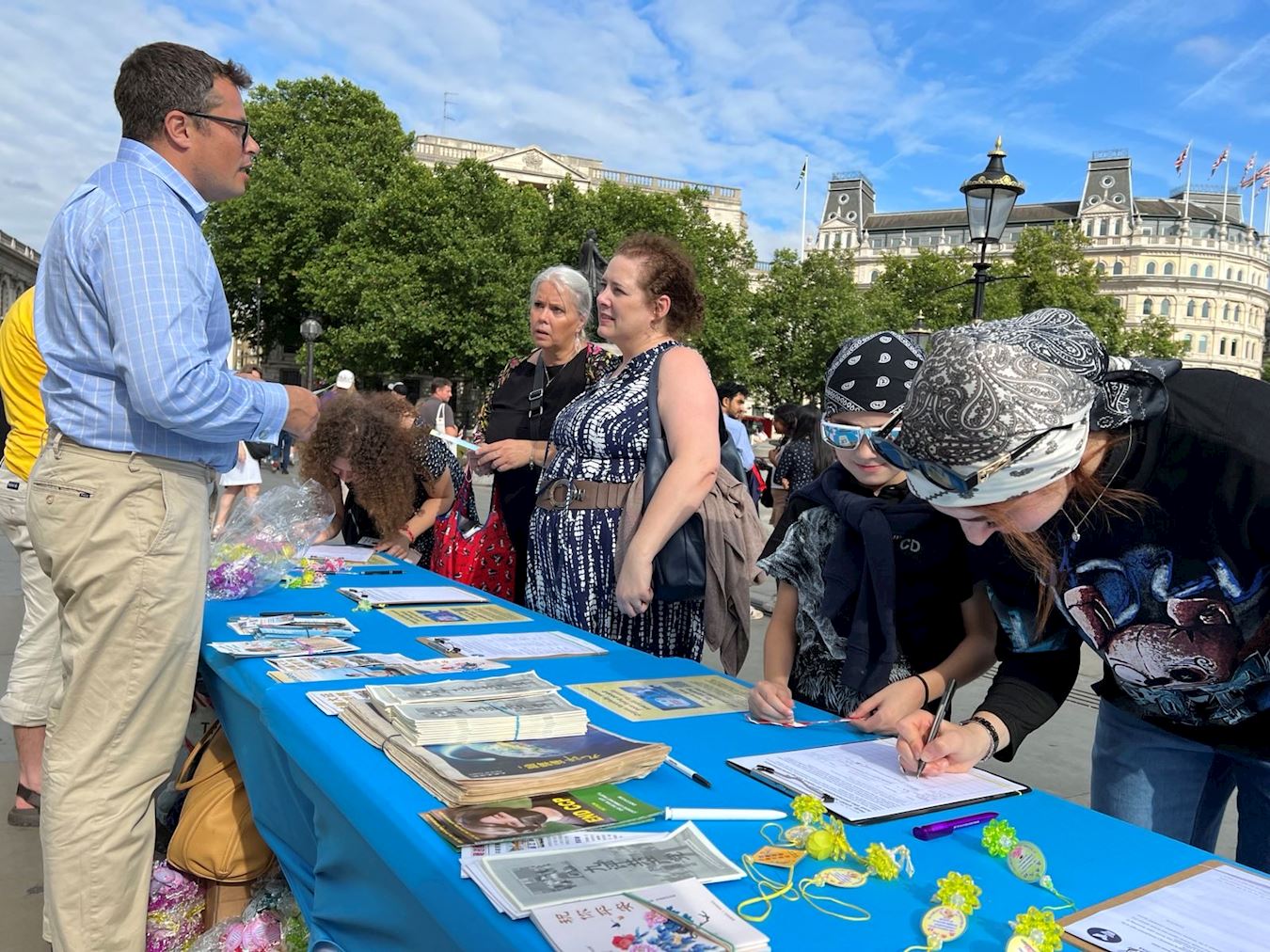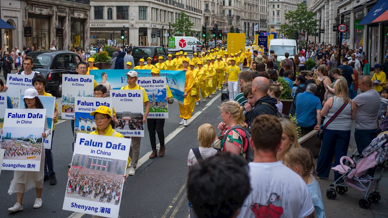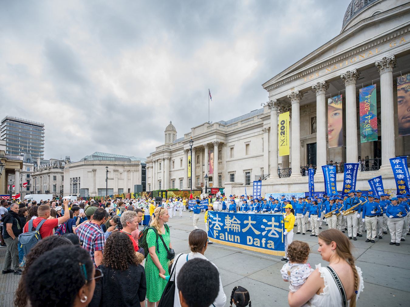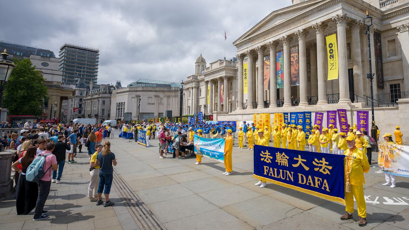 游行队伍浩浩荡荡,一路途经伦敦市中心最繁华的商业街和热闹的唐人街,最后抵达著名的特拉法加广场(Trafalgar Square)。在广场北台的英国国家肖像馆门前,法轮功学员举行了新闻发布会,揭露中共的暴行。并向首相办公室递交了一箱沉甸甸的请愿书,这份请愿书凝聚了超过三万名英国民众的签名,他们共同呼吁英国政府能够对法轮功学员的遭遇施以援手,帮助早日结束这场迫害。