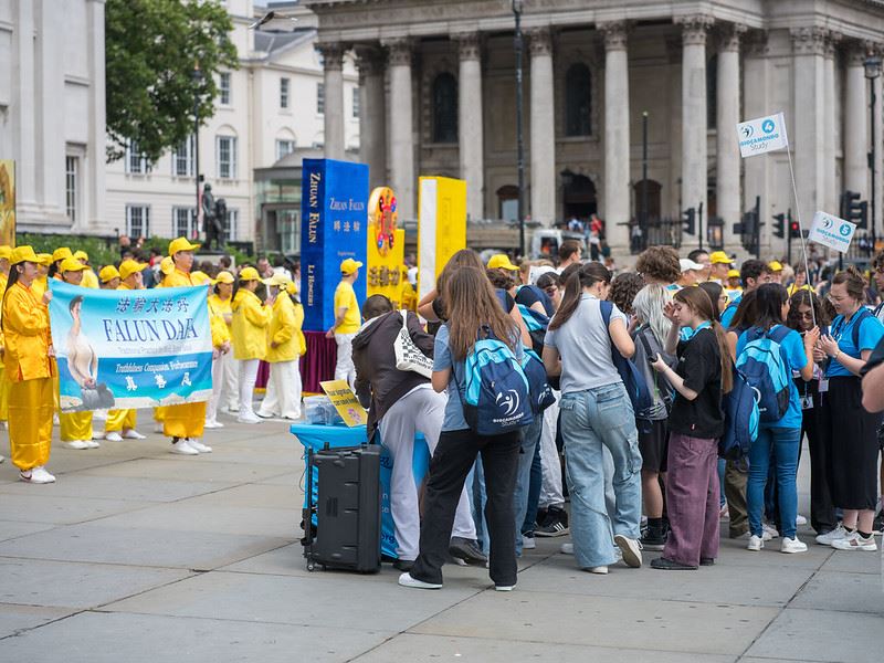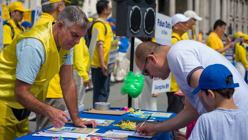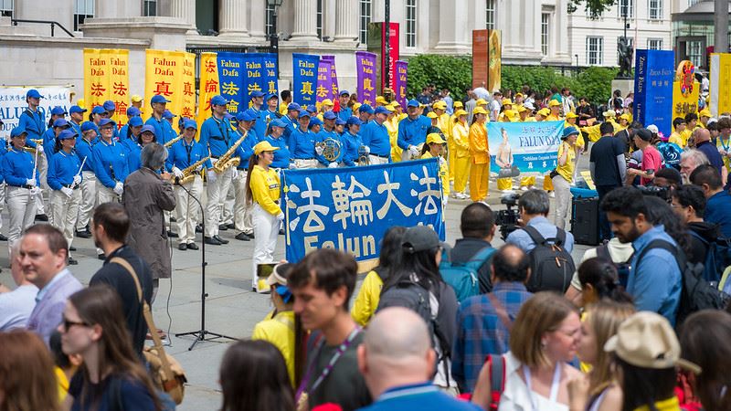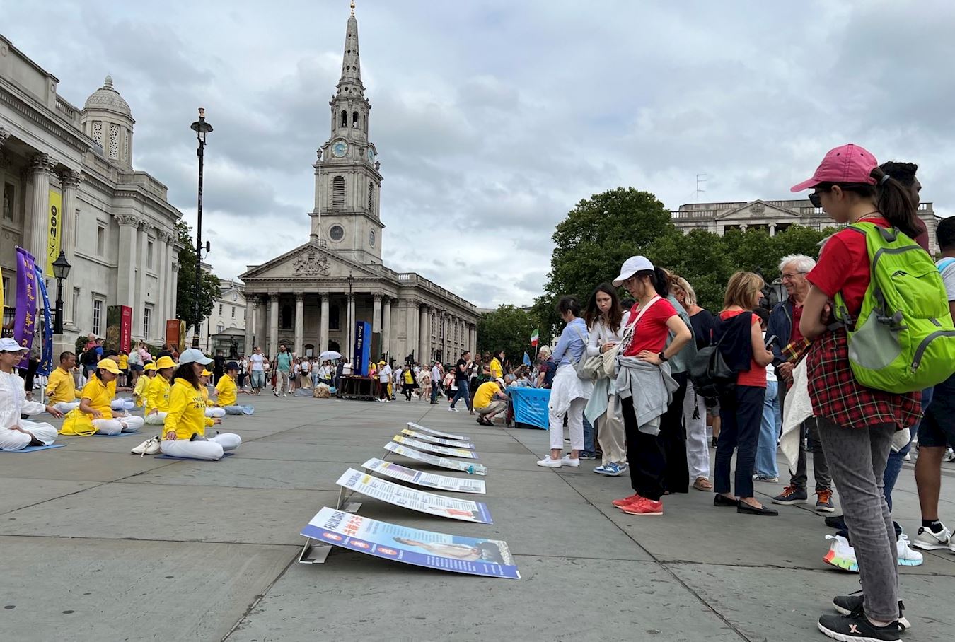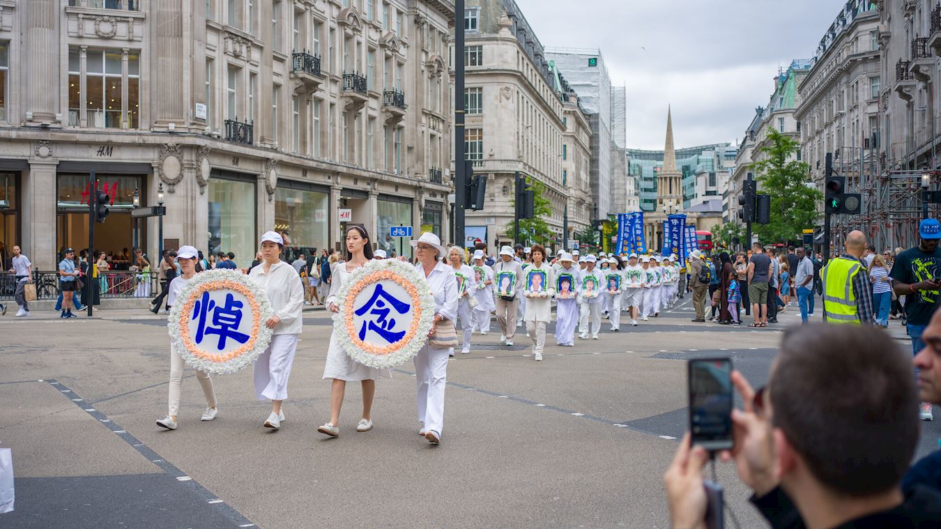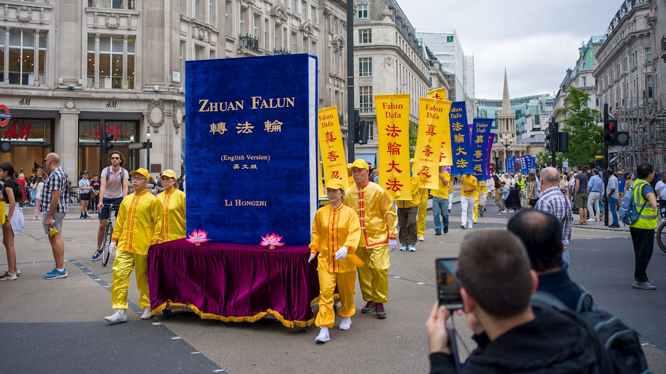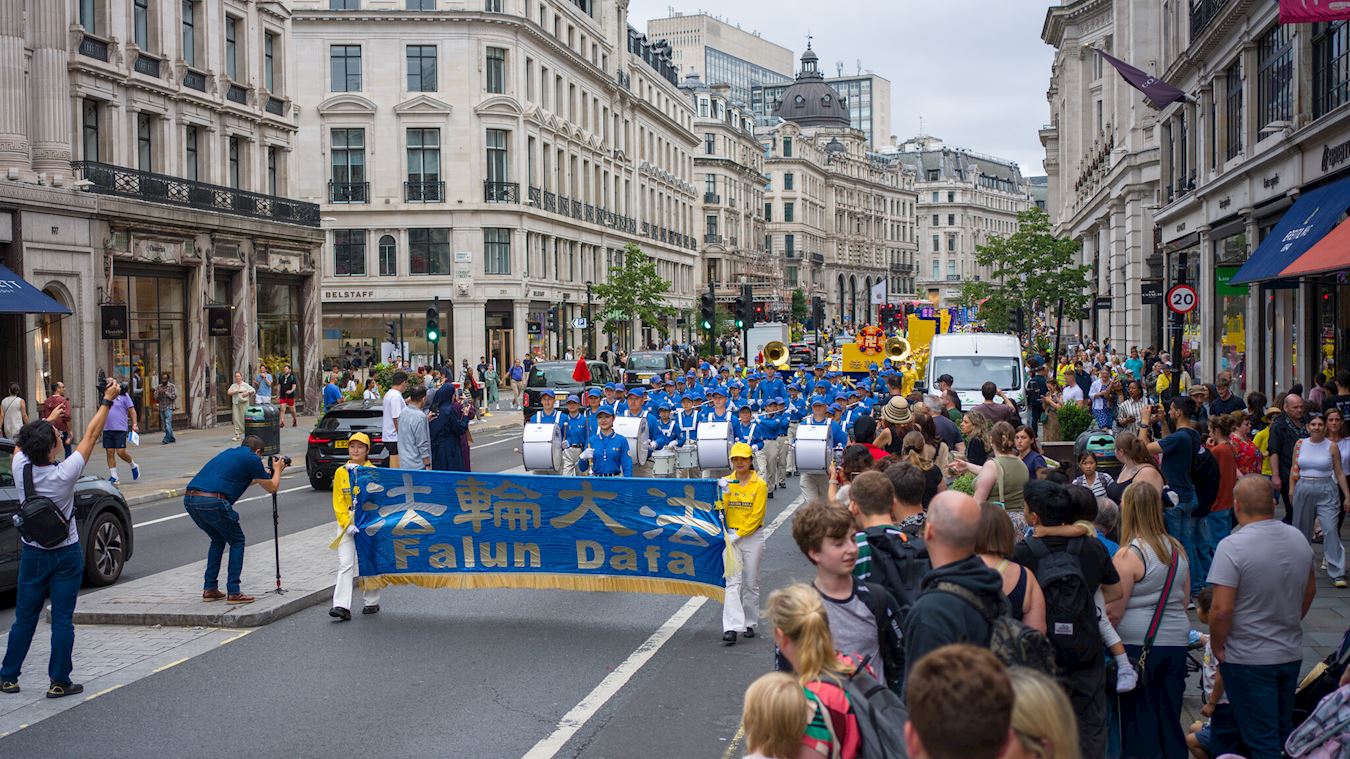 游行队伍浩浩荡荡,一路途经伦敦市中心最繁华的商业街和热闹的唐人街,最后抵达著名的特拉法加广场(Trafalgar Square)。在广场北台的英国国家肖像馆门前,法轮功学员举行了新闻发布会,揭露中共的暴行。并向首相办公室递交了一箱沉甸甸的请愿书,这份请愿书凝聚了超过三万名英国民众的签名,他们共同呼吁英国政府能够对法轮功学员的遭遇施以援手,帮助早日结束这场迫害。