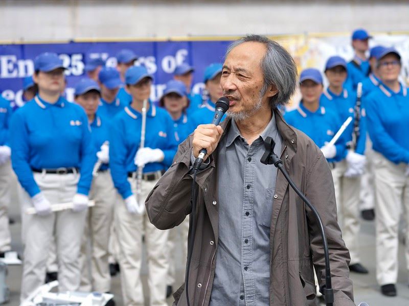 旅英作家马建在集会中发言,表达了对法轮功学员的尊敬,赞扬他们抵抗中共暴政的勇气。他表示,法轮功学员的和平抗争正在改变着政治环境。他还呼吁人们铭记那些遭受迫害的法轮功学员。最后马建振臂高呼“停止迫害法轮功”。