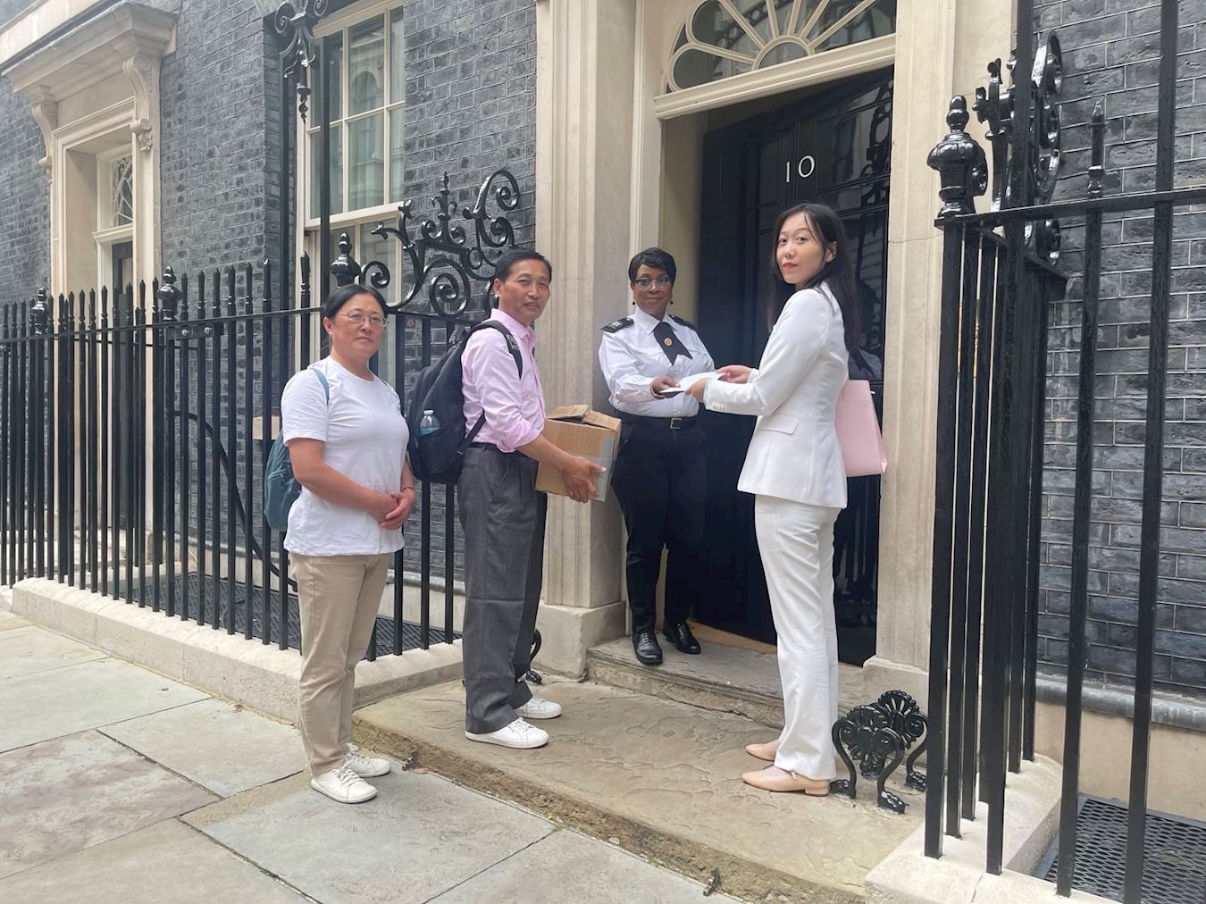 新闻发布会结束后,几位法轮功学员,把法轮大法佛学会写给首相的一封信,和有31253个签名的请愿书,送到唐宁街十号的首相府,递交英国新任首相基尔·斯塔默。