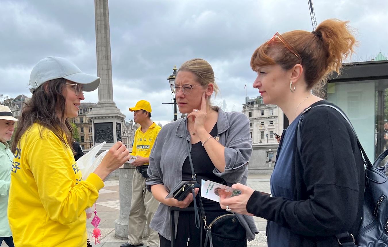 露易丝(Louise)来自丹麦,在一家咨询公司负责招聘工作,她表示自己被传单上的信息震惊了,她说:“尽管我生活在一个信息非常发达的国家,但我以前从未听说过这件事。所以我相当震惊。”她表示,真善忍是每个人都应该遵循的原则,她说:“我觉得每个人都应该按照这些原则生活。仅仅因为有人按照这些原则生活,他们的器官就被活摘,想想就觉得可怕。”