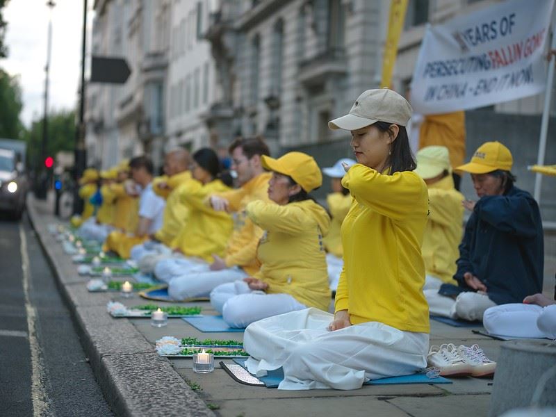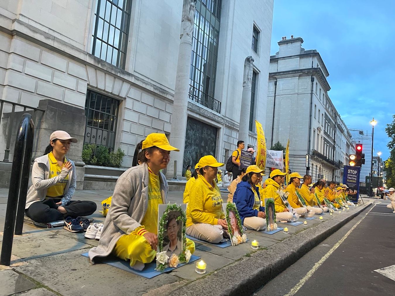 夜幕降临,伦敦中国大使馆外却依然灯火通明。结束了白天游行活动的部分法轮功学员,在这里举行烛光守夜,悼念那些被中共迫害致死的法轮功学员。点点烛光,寄托着哀思,也照亮了夜空,传递着希望。