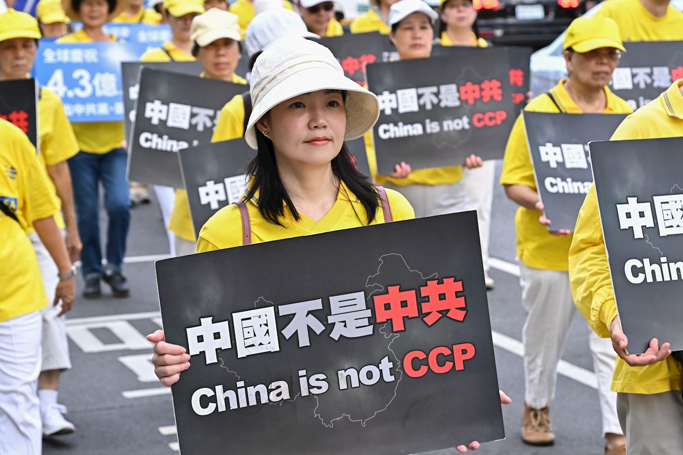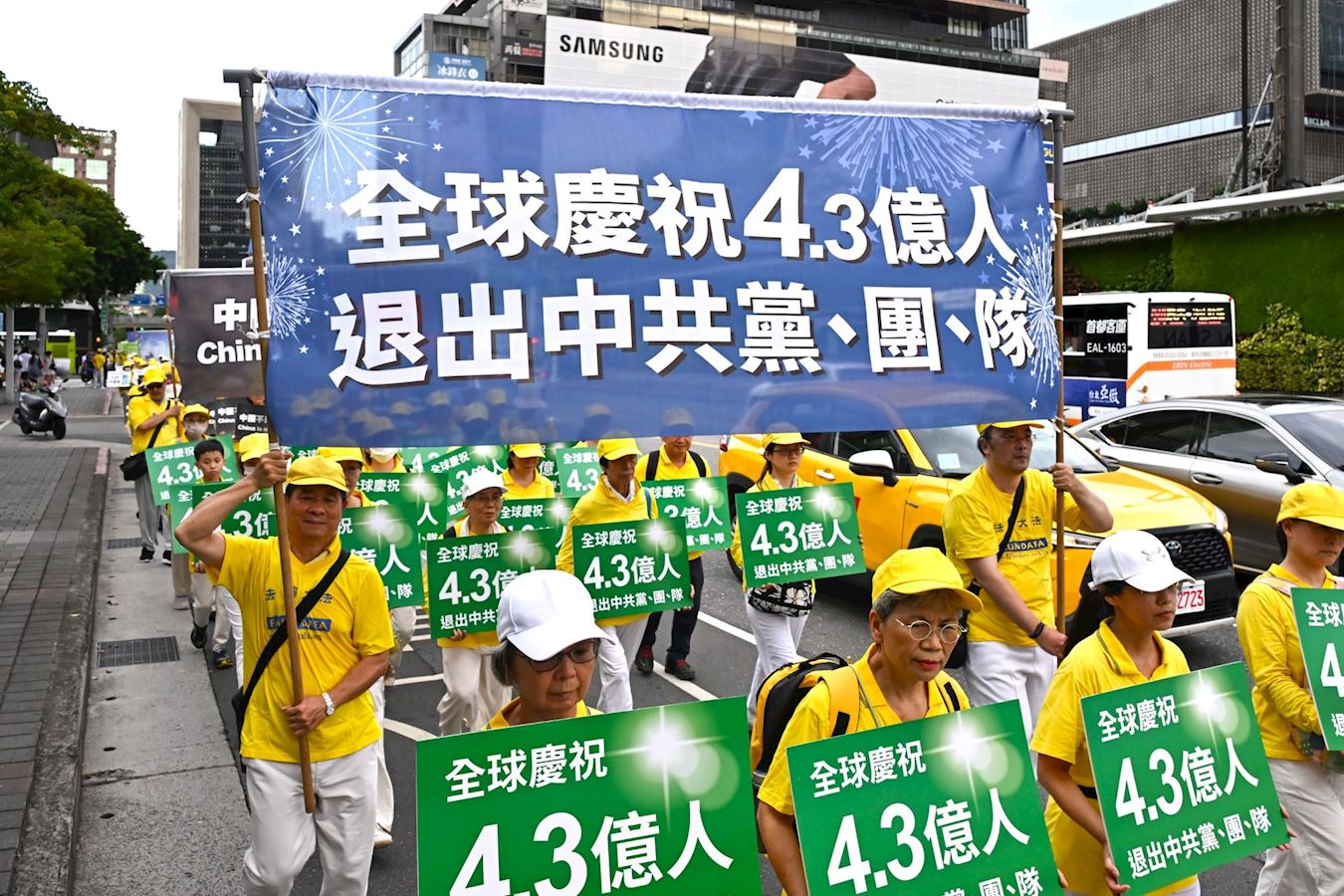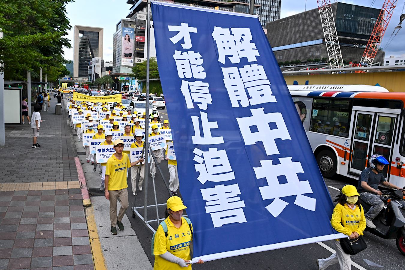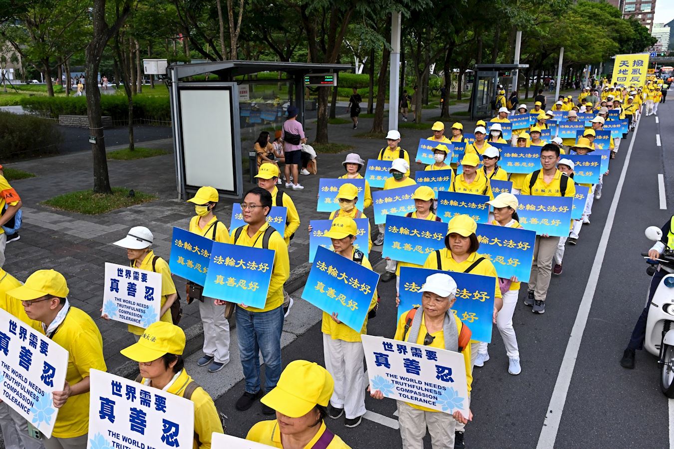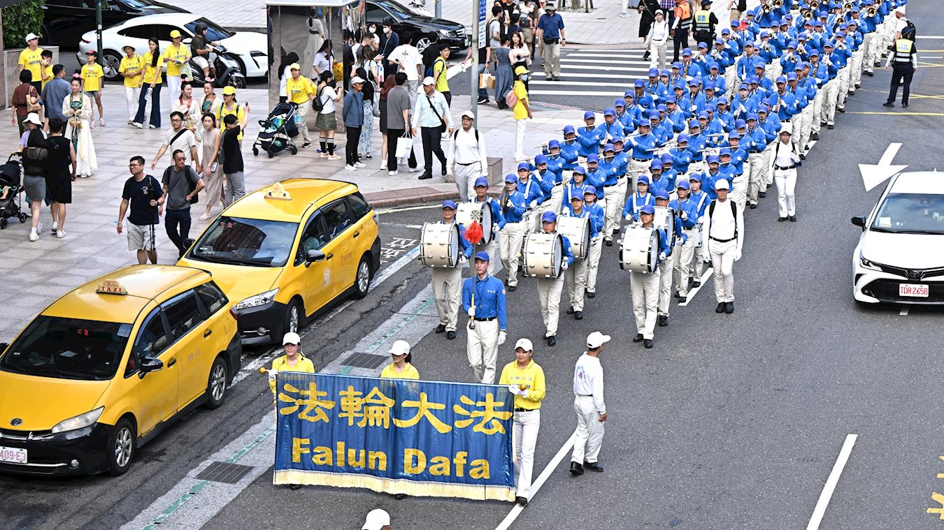 游行队伍由台湾天国乐团打头阵,紧接着是四大方阵:“大法洪传”、“千古奇冤”、“三:退.大潮”及“结束迫害”,最后由腰鼓队压轴。游行队伍中,学员手持显目的横幅:“世界需要真善忍”、“中共迫害真善忍 天理不容”、“了解真相是得救的希望”、“中国不是中共”、“制止中共活摘器官”、“解体中共 结束迫害”,直接传递真实讯息。