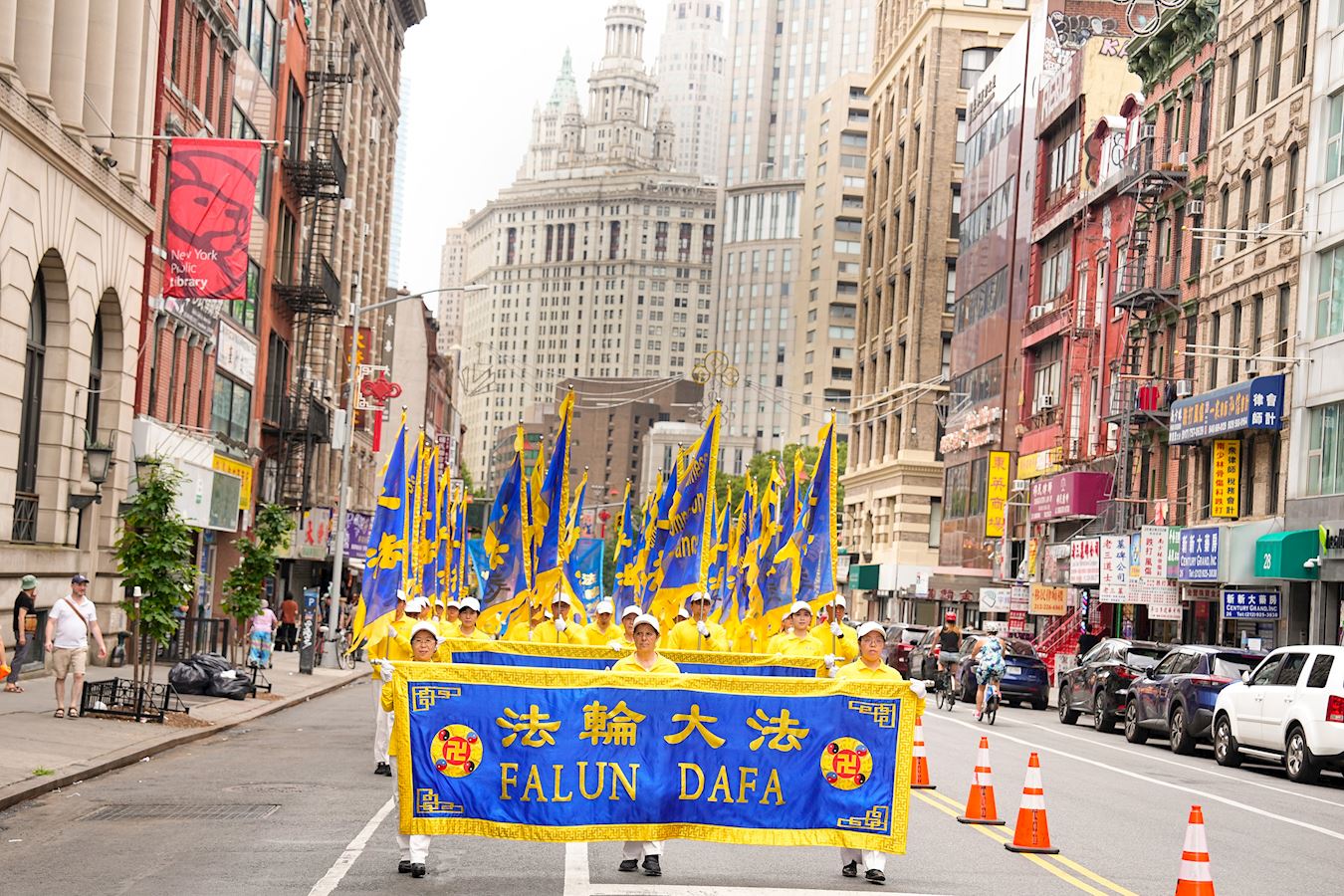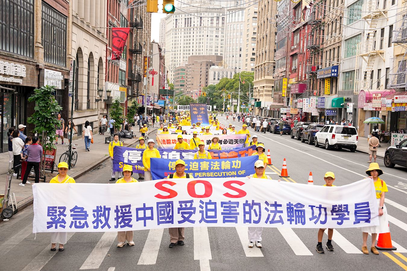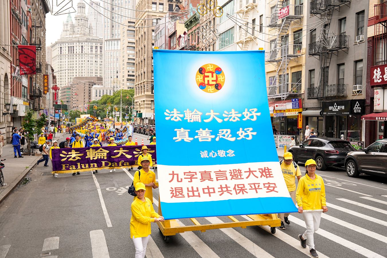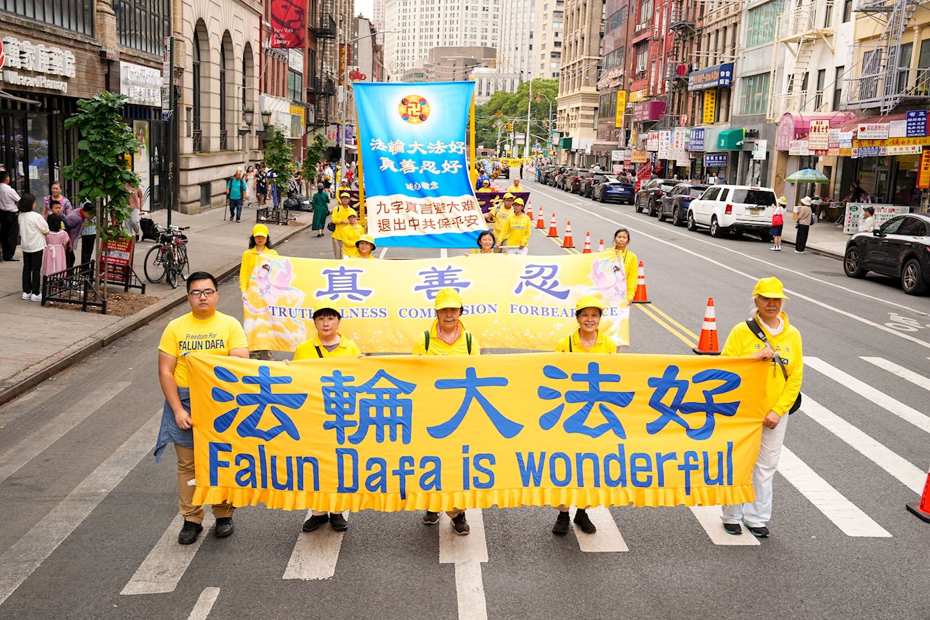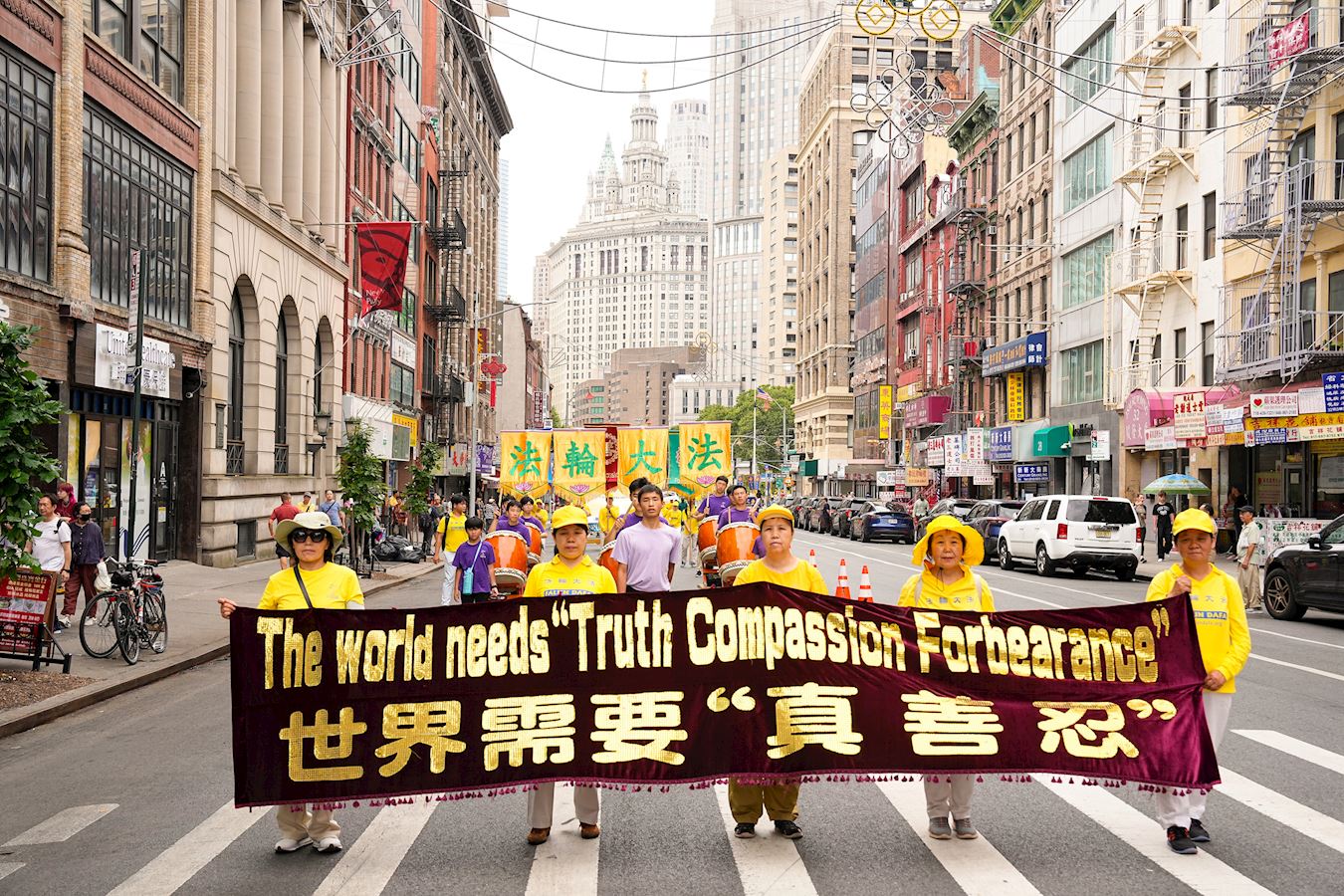 这天,纽约华人历史最悠久的曼哈顿唐人街乐声嘹亮,队伍浩浩荡荡。游行分三大方阵,分别是:“法轮大法好”、“停止迫害法轮功”和“声援4.3亿中国人退出中共党团队。