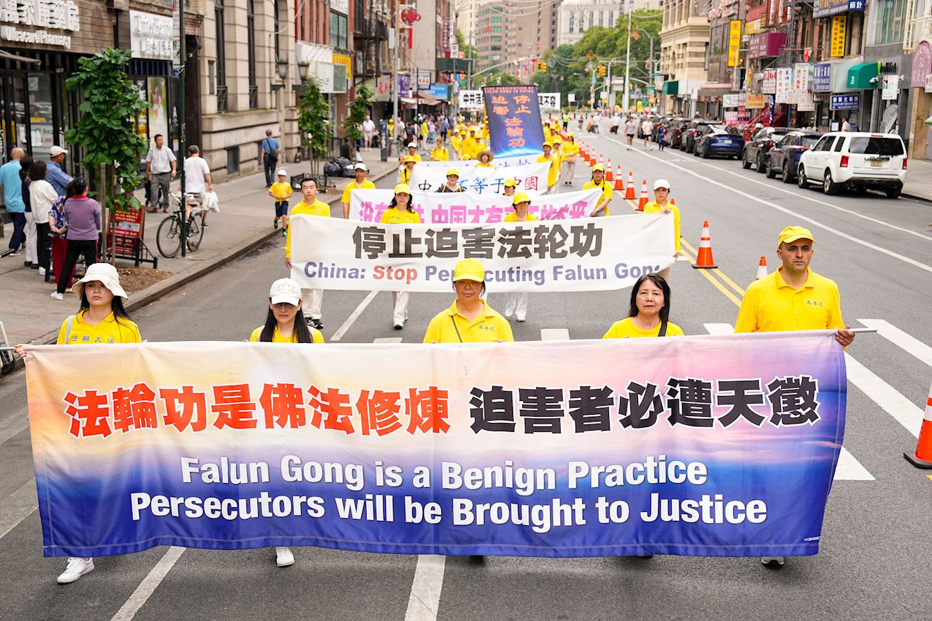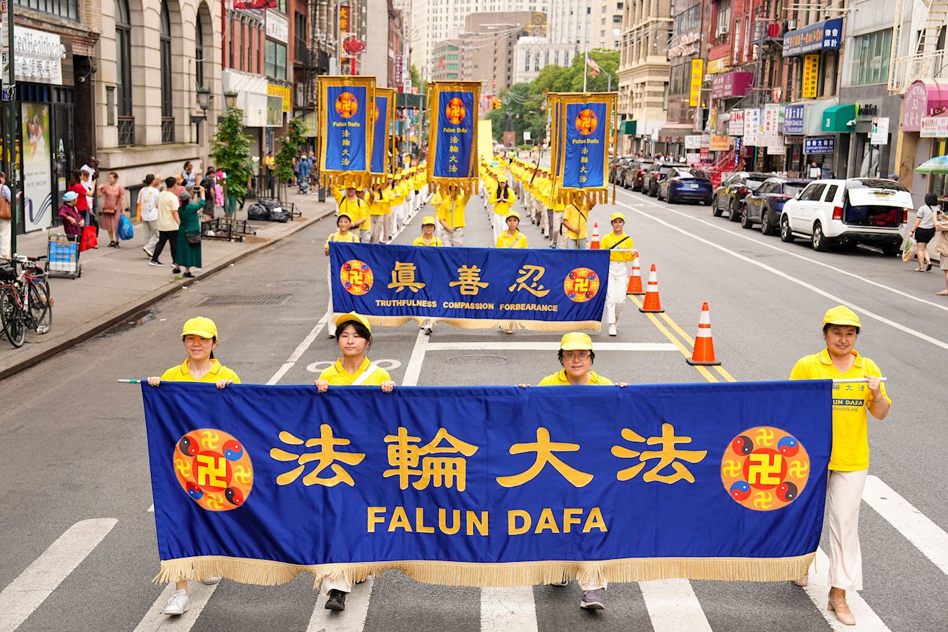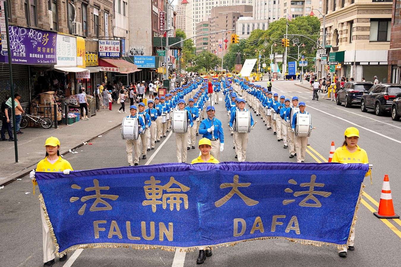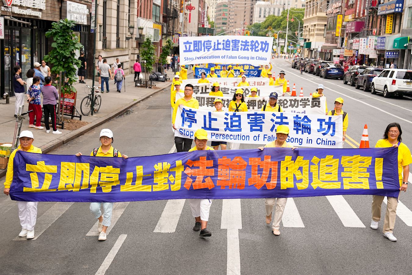 这天,纽约华人历史最悠久的曼哈顿唐人街乐声嘹亮,队伍浩浩荡荡。游行分三大方阵,分别是:“法轮大法好”、“停止迫害法轮功”和“声援4.3亿中国人退出中共党团队。
