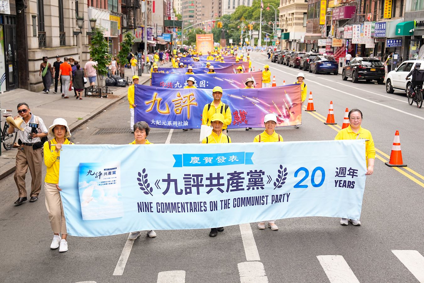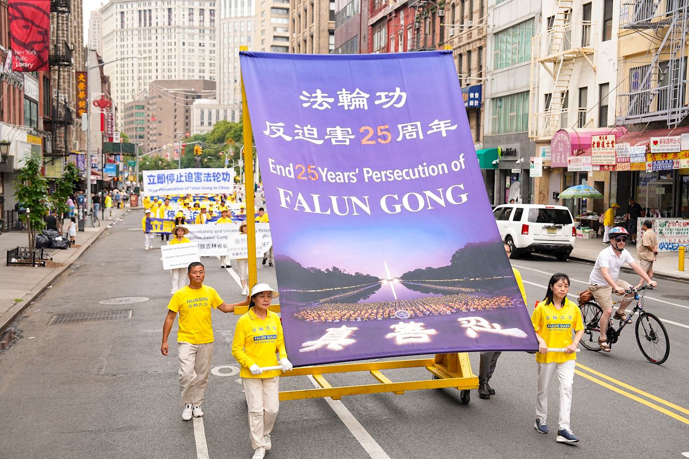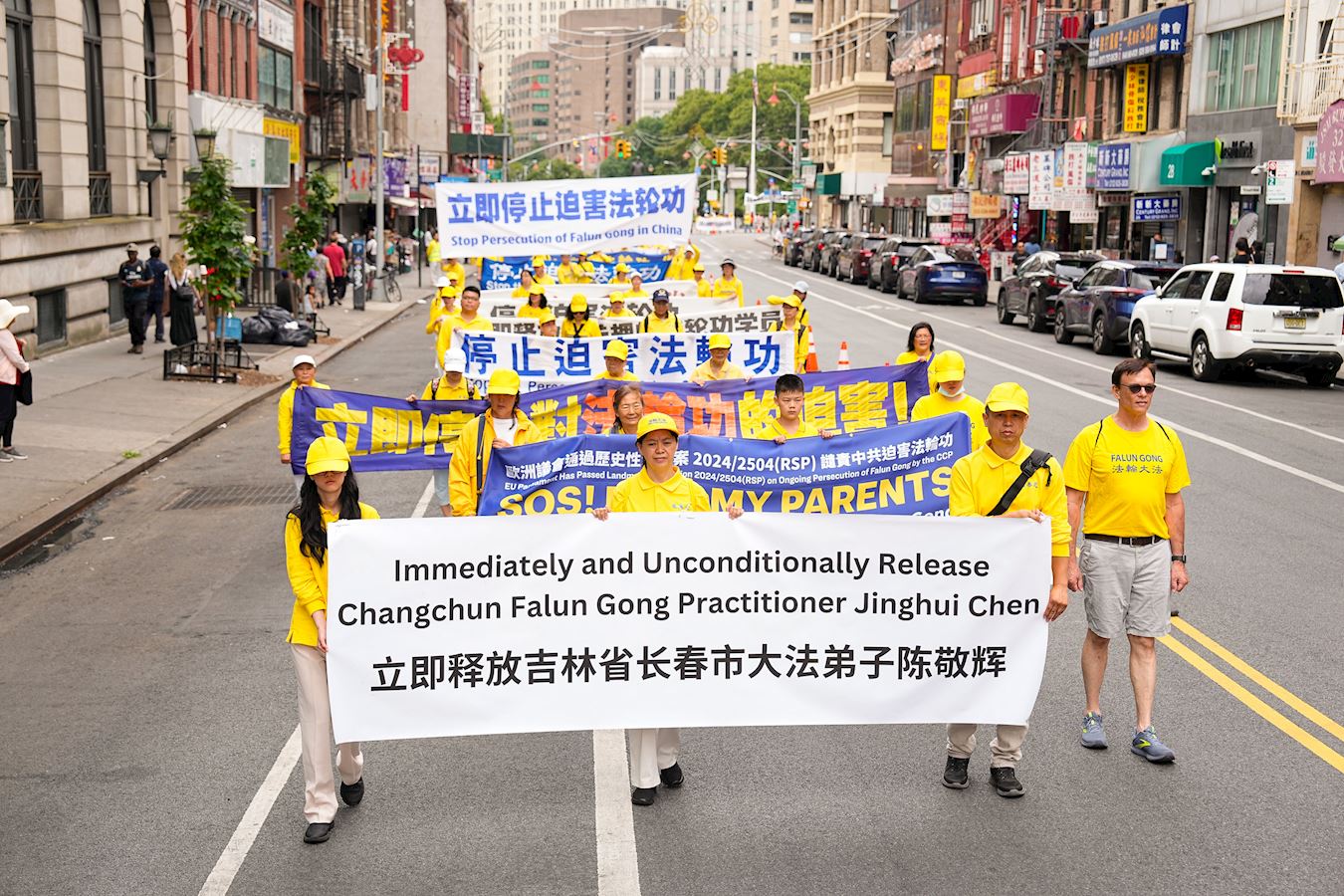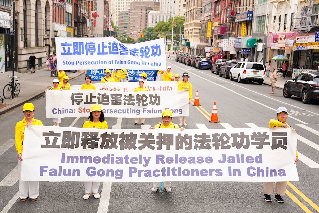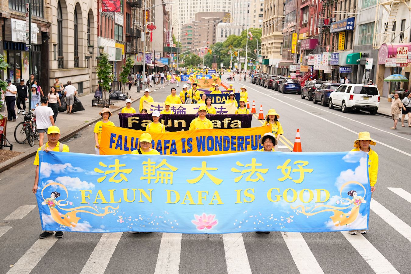 这天,纽约华人历史最悠久的曼哈顿唐人街乐声嘹亮,队伍浩浩荡荡。游行分三大方阵,分别是:“法轮大法好”、“停止迫害法轮功”和“声援4.3亿中国人退出中共党团队。
