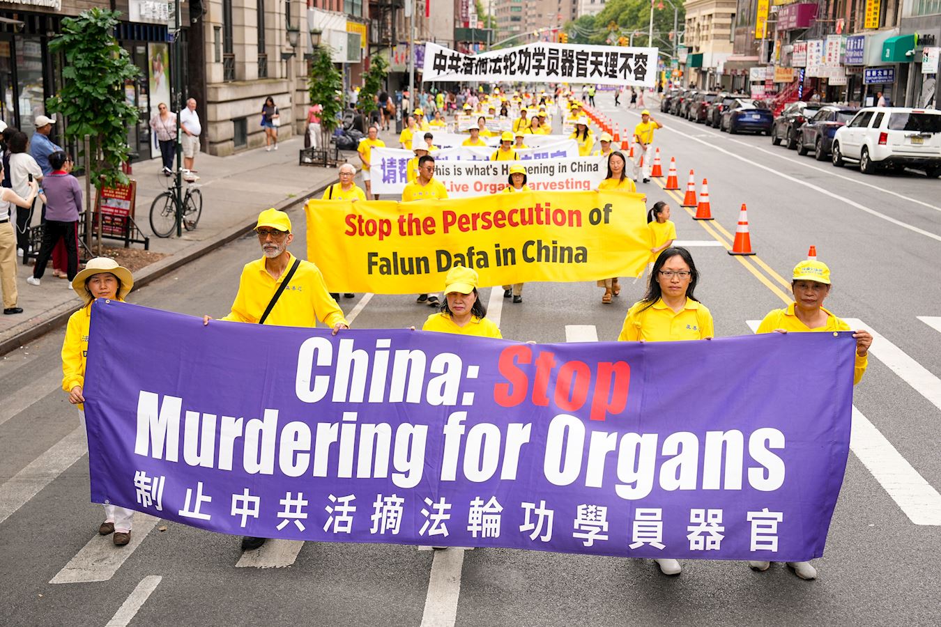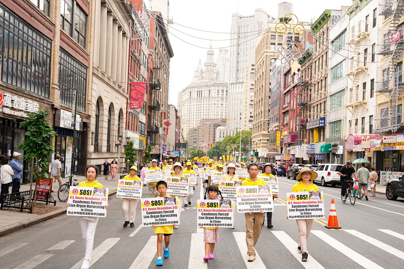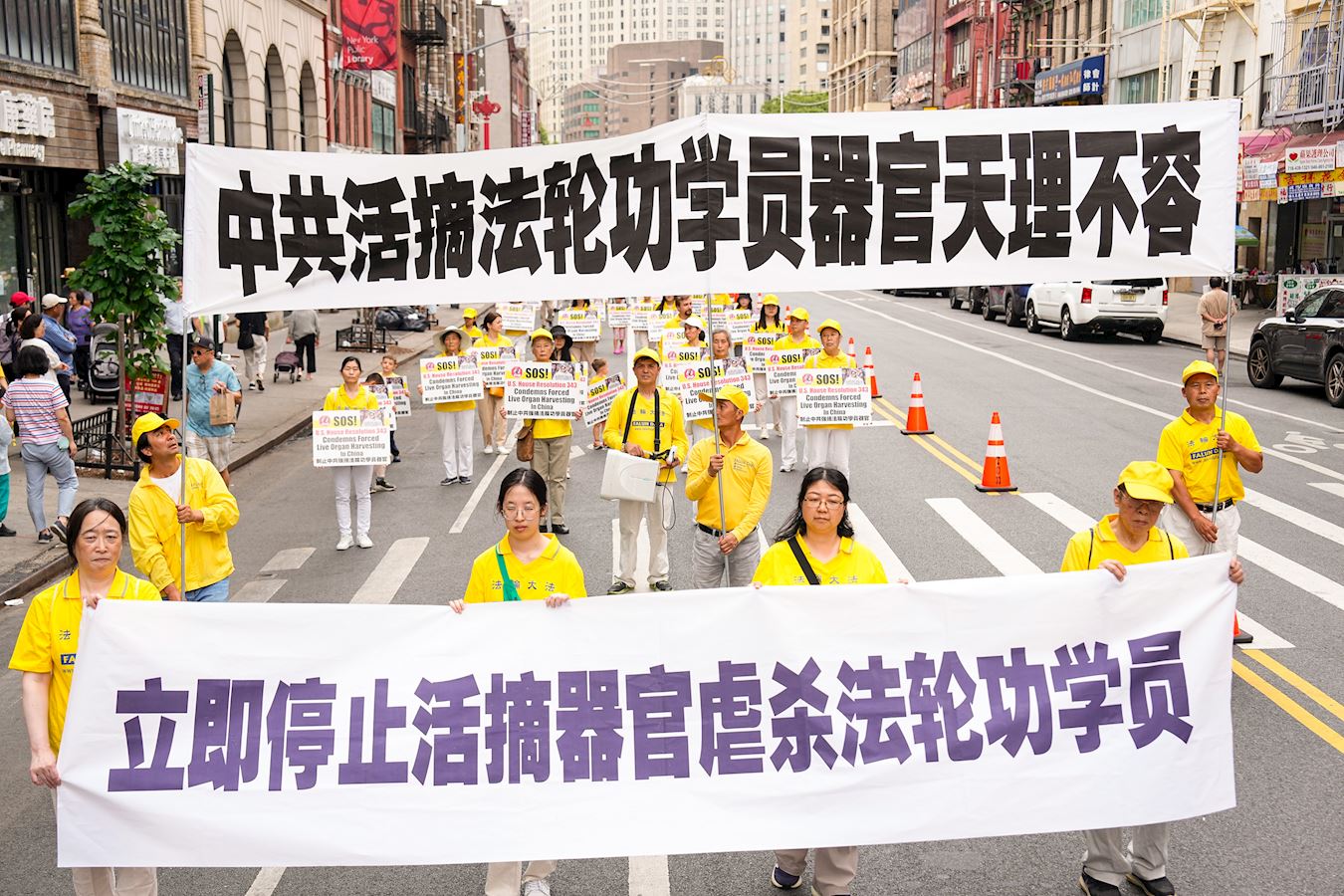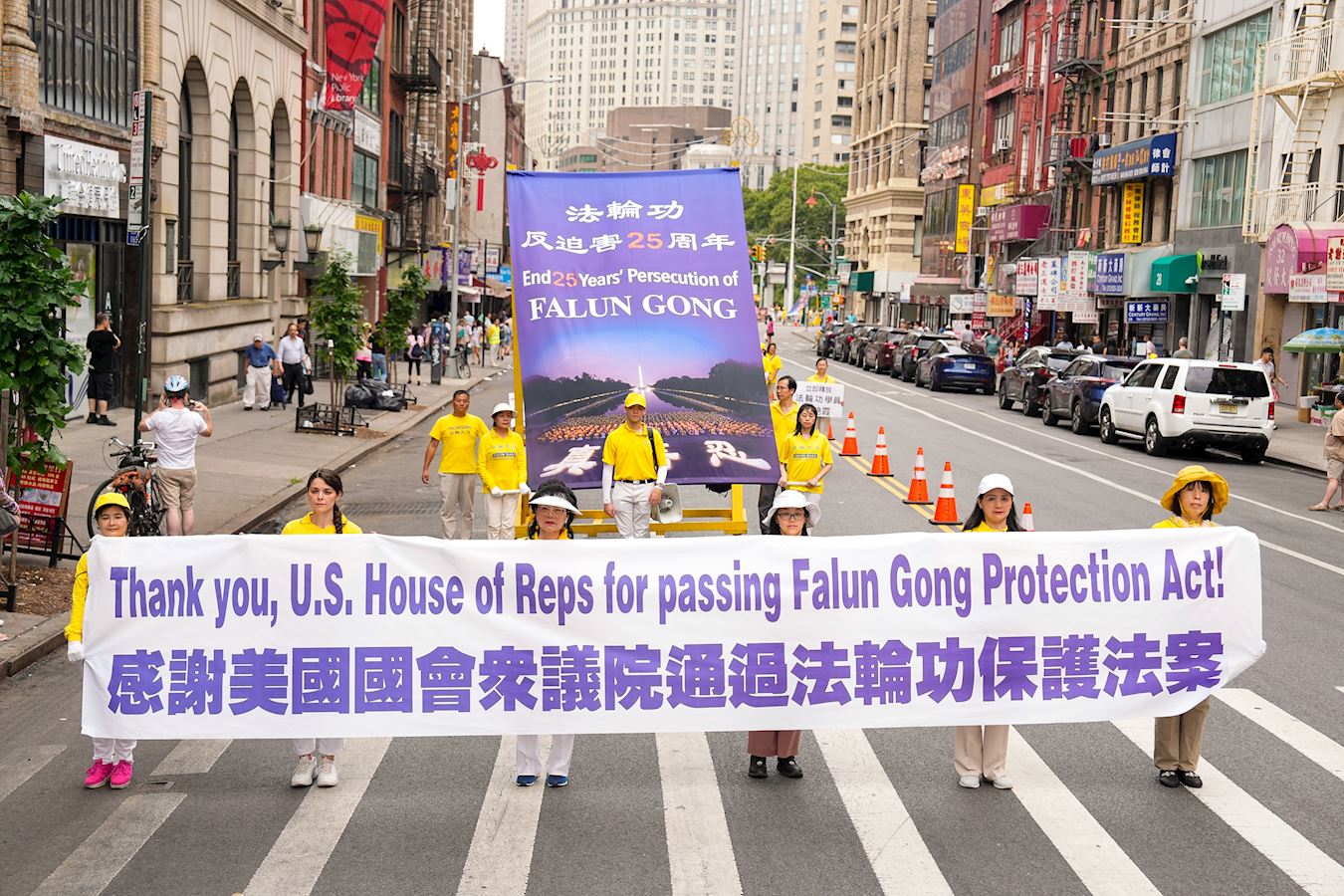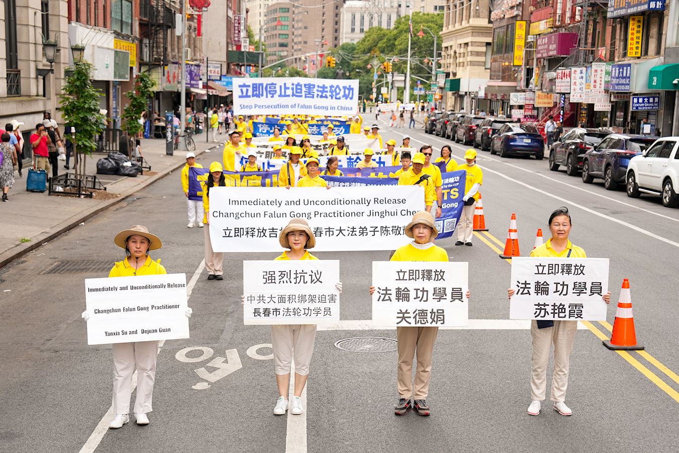 这天,纽约华人历史最悠久的曼哈顿唐人街乐声嘹亮,队伍浩浩荡荡。游行分三大方阵,分别是:“法轮大法好”、“停止迫害法轮功”和“声援4.3亿中国人退出中共党团队。