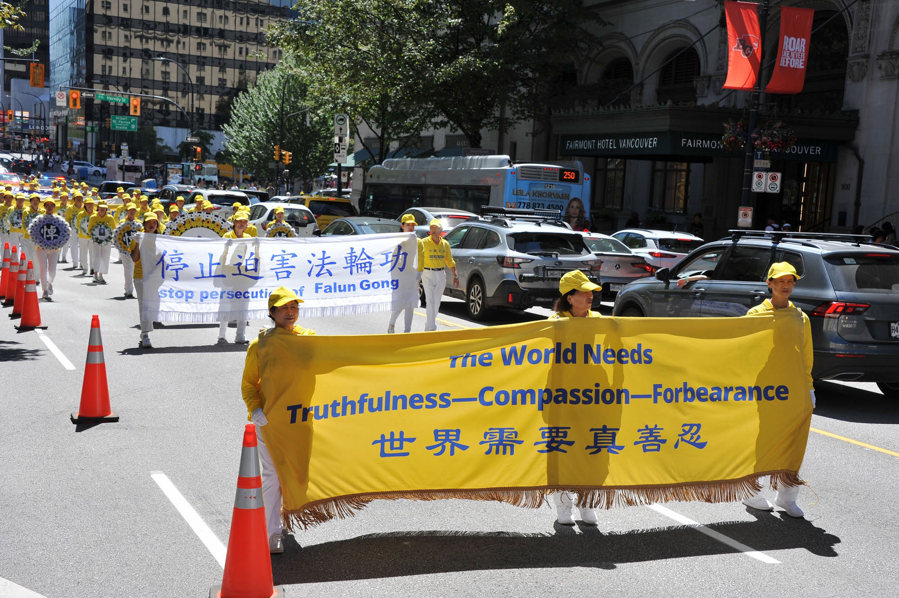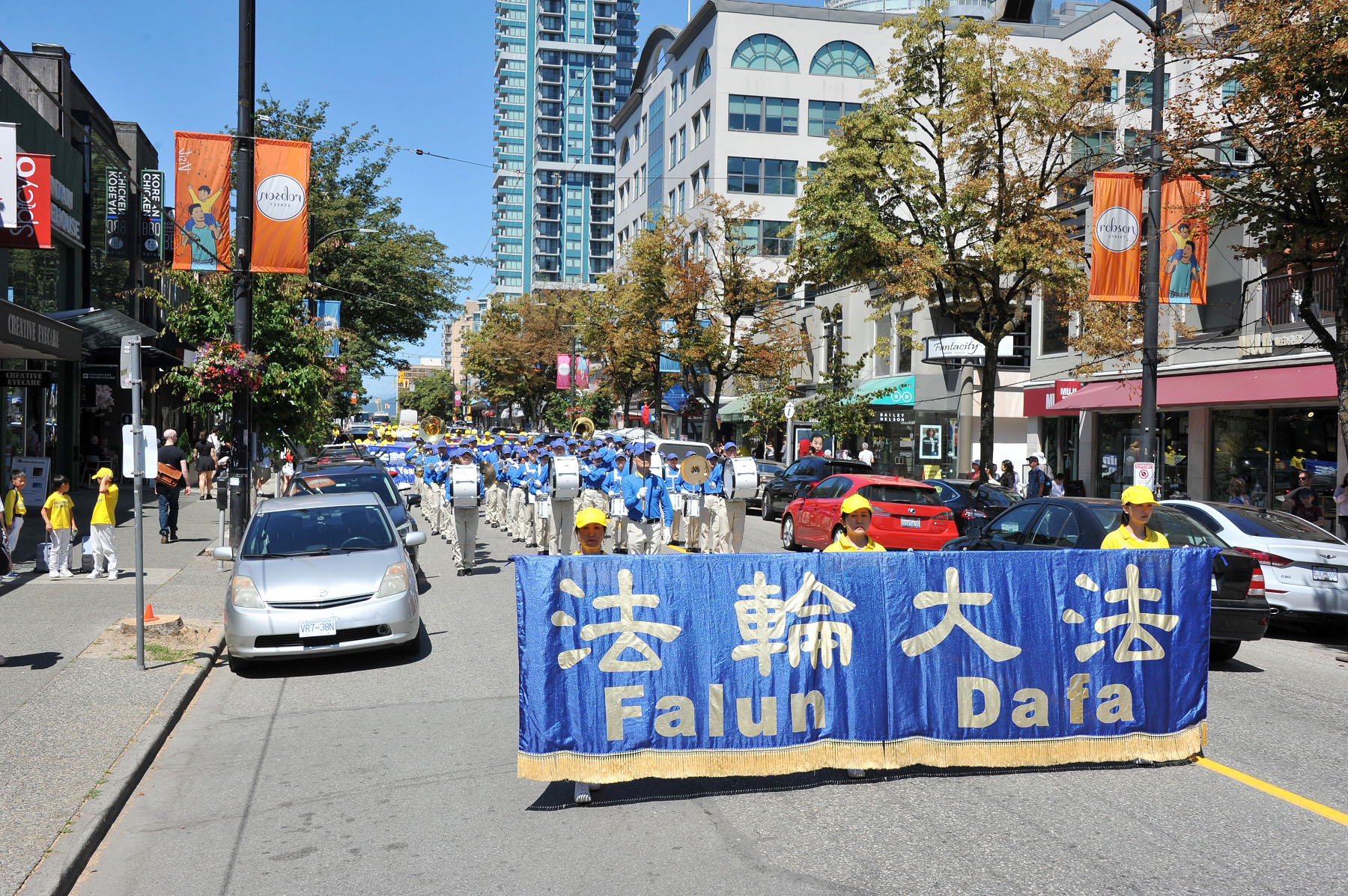 七月二十日,法轮功学员在市中心举行盛大游行。游行队伍从温哥华艺术馆出发,途径市中心最繁华的商业街区和加拿大广场等热门景点。市中心人潮涌动,游行队伍吸引了众多民众和游客驻足观看,人们纷纷举起手机拍照录影、有的挥手致意、竖起大拇指。